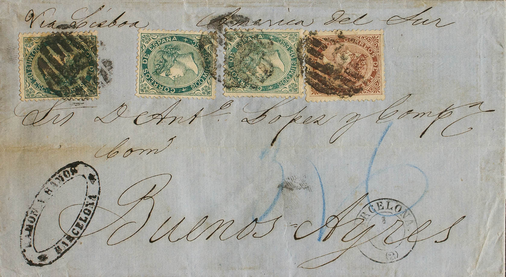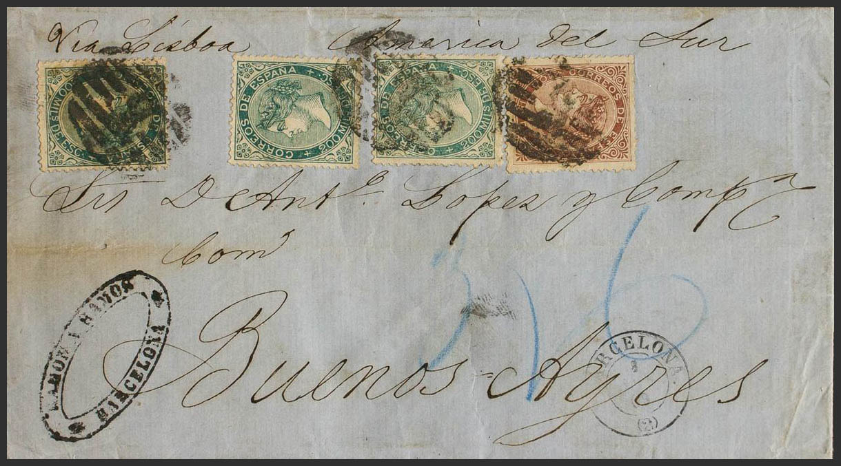 99, 100(3). 1869. 100 mils castaño y 200 mils verde, tres sellos. BARCELONA a BUENOS AIRES (ARGENTINA), circulada vía Lisboa. MAGNIFICA Y RARISIMO FRANQUEO DE DOBLE PORTE UTILIZANDO EL INUSUAL 100 MILS.
