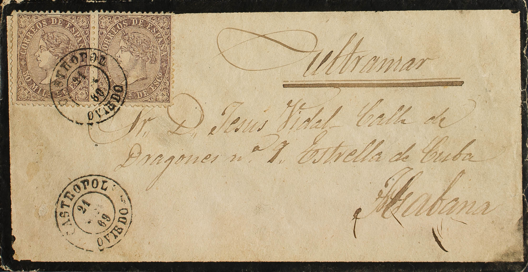 98(2). 1869. 50 mils violeta, pareja. CASTROPOL a LA HABANA. Matasello CASTROPOL / OVIEDO, doble porte. MAGNIFICA Y RARA.