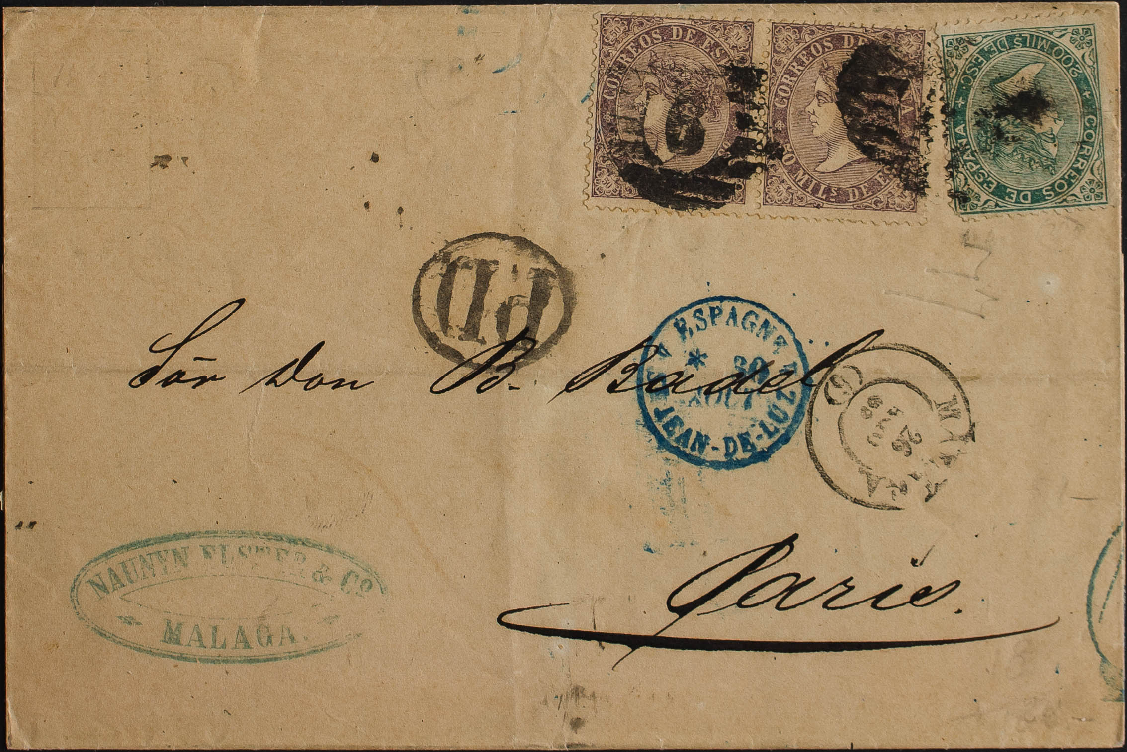 98(2), 100. 1869. 50 mils violeta, pareja y 200 mils verde. MALAGA a PARIS (FRANCIA). MAGNIFICA E INUSUAL COMBINACION DE FRANQUEO PARA COMPLETAR LA TARIFA DE DOBLE PORTE A FRANCIA.