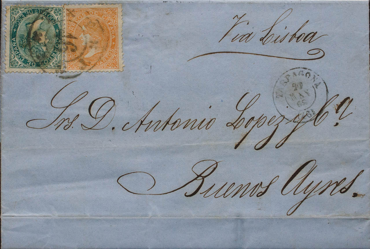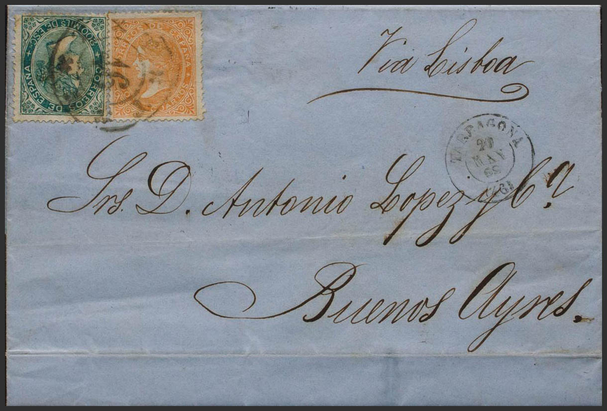 88, 100. 1869. 200 mils verde y 12 cuartos amarillo. TARRAGONA a BUENOS AIRES (ARGENTINA). MAGNIFICA Y RARA TARIFA DE 28 CUARTOS A BUENOS AIRES, PIEZA DE ENORME BELEZA.
