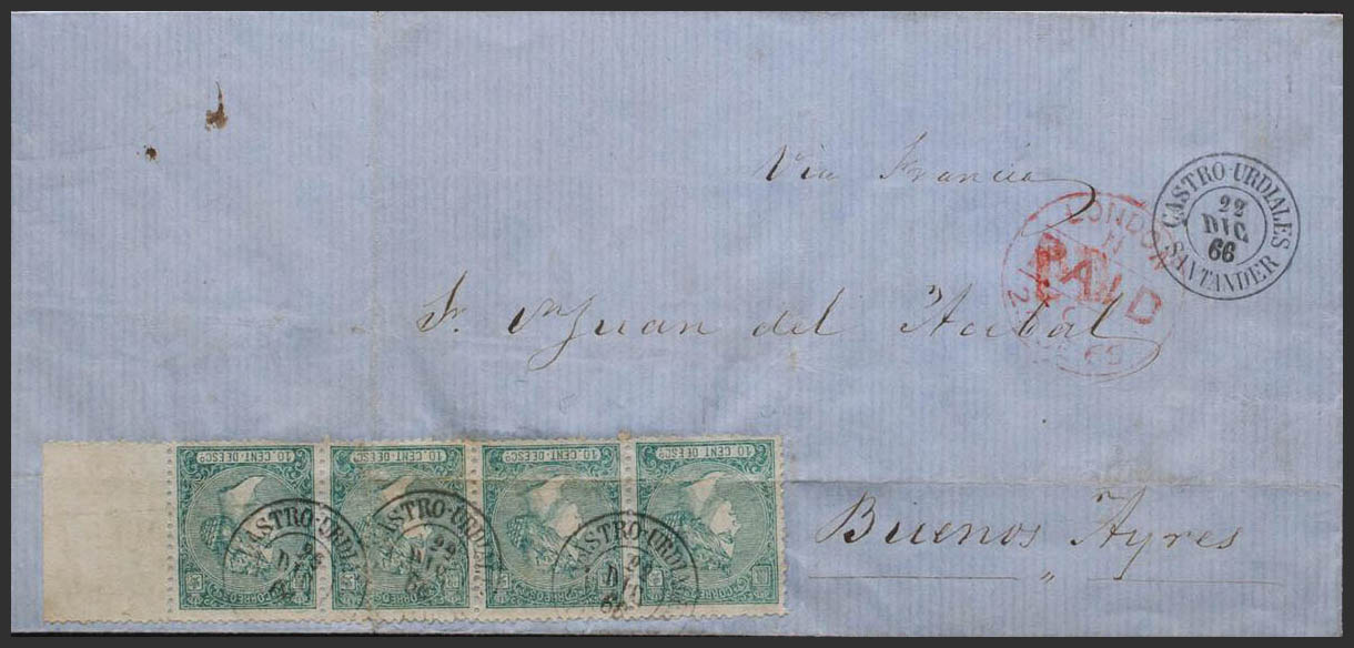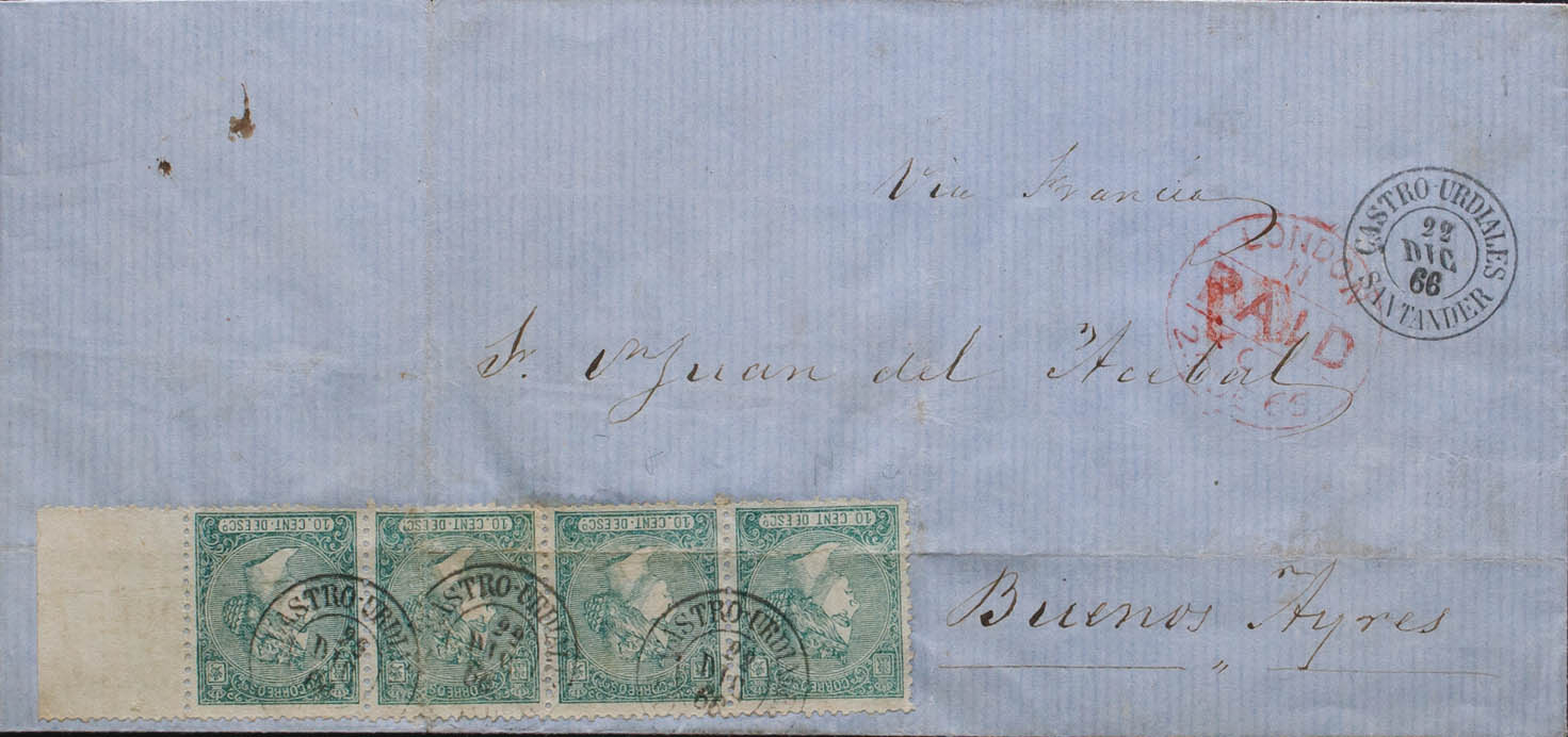 84(4). 1866. 10 cts verde, tira de cuatro. CASTRO-URDIALES a BUENOS AIRES (ARGENTINA). Matasello CASTRO-URDIALES / SANTANDER (doblez de archivo). MAGNIFICA Y RARISIMO FRANQUEO DE CUADRUPLE PORTE A CUBA.
