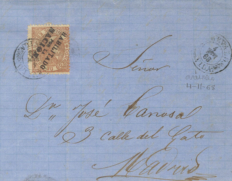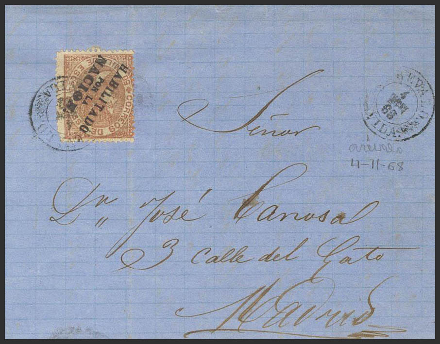 1868. 50 cts castaño amarillo. BAYONA (FRANCIA) a MADRID, transportada privadamente hasta Arévalo, donde se deposita en el correo. Matasello AREVALO / AVILA. MAGNIFICA Y MUY RARA. Cert. GRAUS.