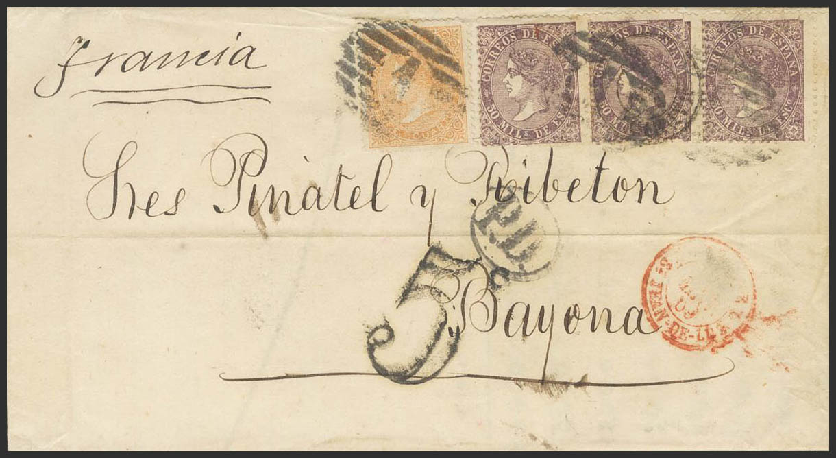 98(3), 89. 1869. 50 mils, tres sellos y 12 cuartos naranja. MADRID a BAYONA (FRANCIA). MAGNIFICA Y RARISIMA COMBINACION PARA COMPLETAR LA TARIFA DE DOBLE PORTE A FRANCIA.