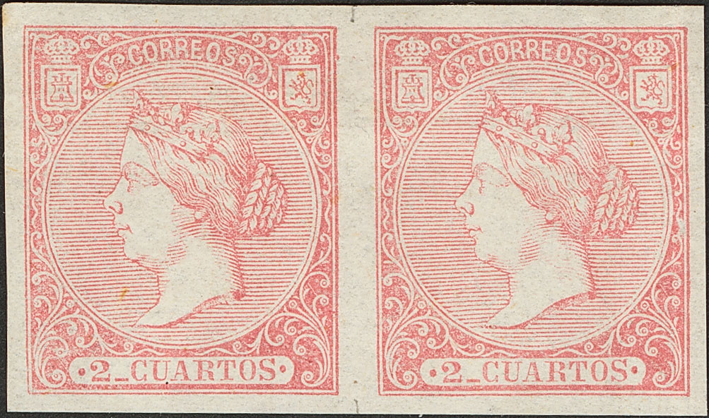 (★) 80s(2). 1866. 2 cuartos rosa, pareja. SIN DENTAR, al dorso impresión del 19 cuartos. MAGNIFICA Y EXTRAORDINARIAMENTE RARA.