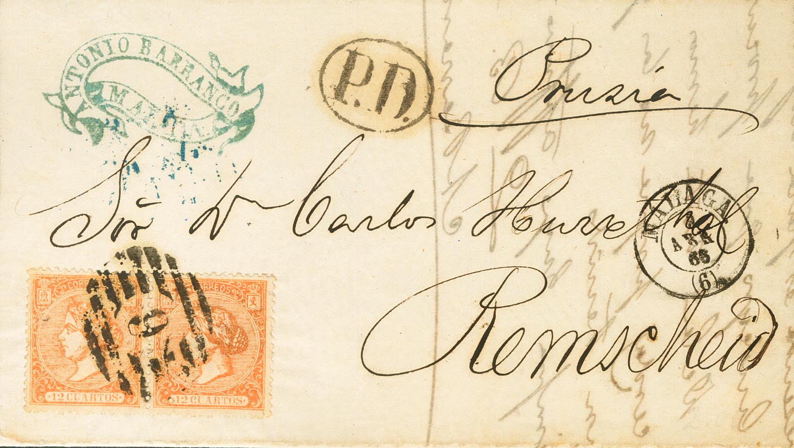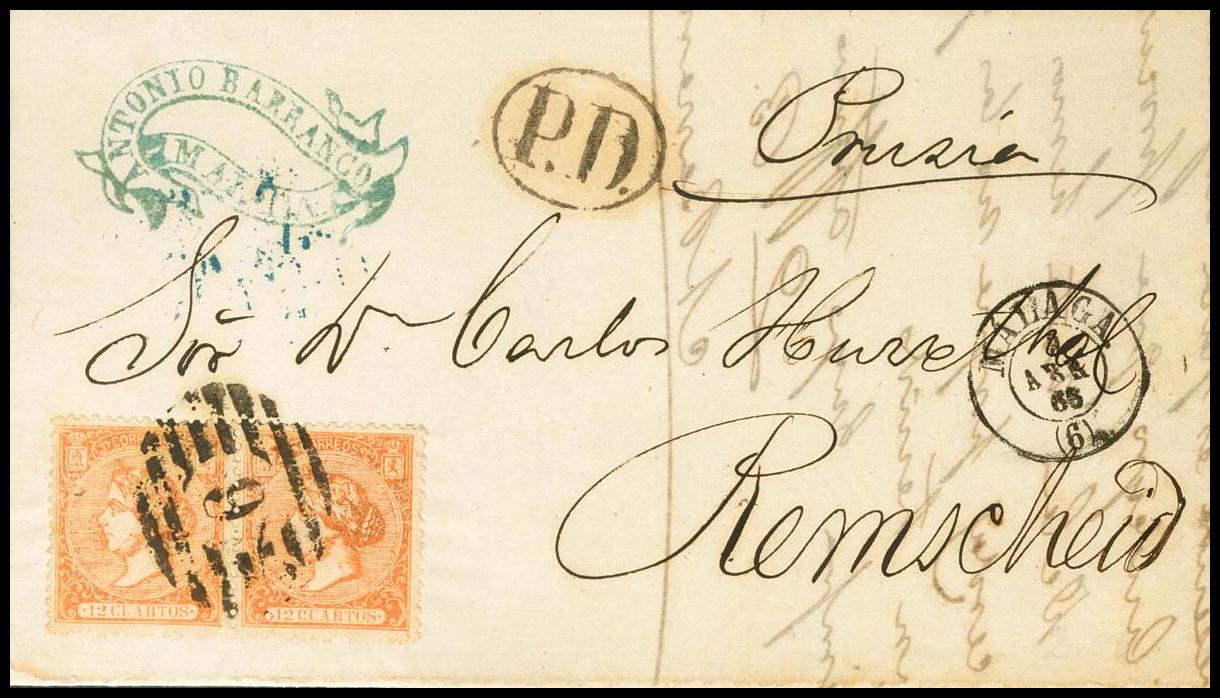 82(2). 1865. 12 cuartos naranja, pareja. Frontal de MALAGA a REMSCHEID (PRUSIA). MAGNIFICA E INUSUAL DESTINO.