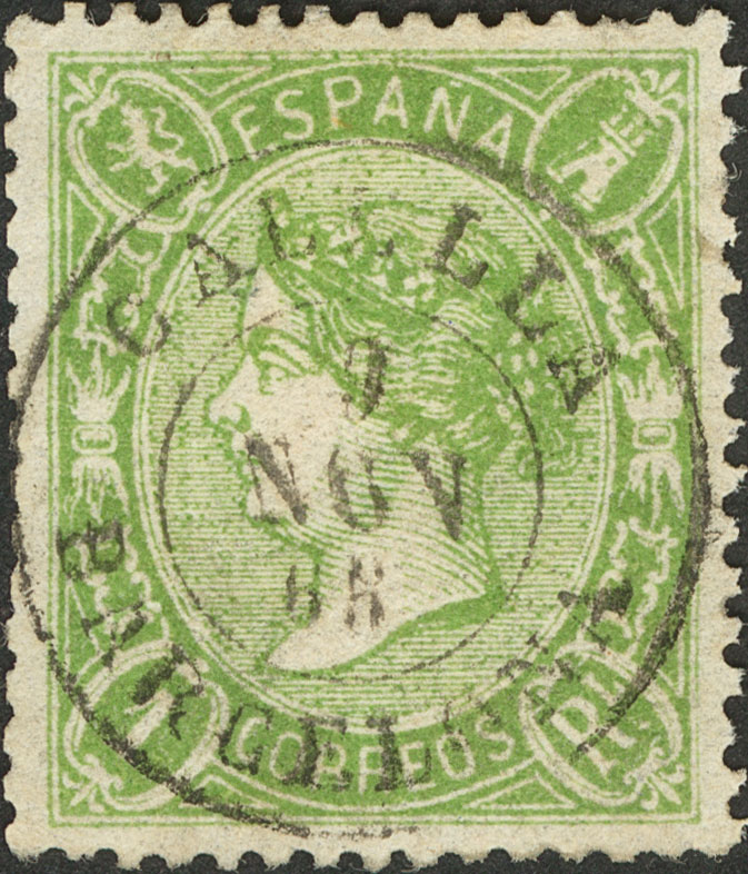 78. 1865. 1 real verde (centraje excepcional). Matasello CALELLA / BARCELONA. PIEZA DE LUJO. Cert. CEM.