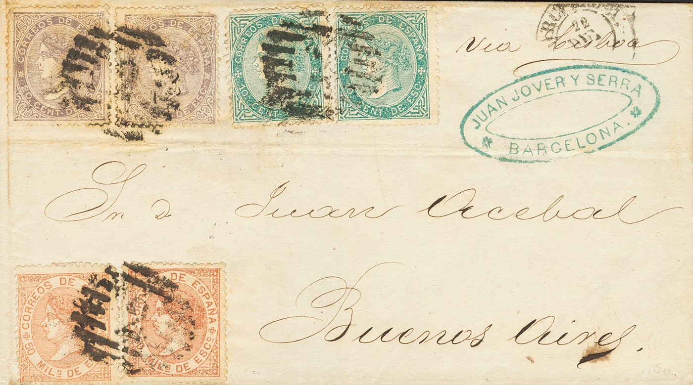 91(2), 92(2), 96(2). 1867. 10 cts verde, dos sellos, 20 cts lila, dos sellos y 50 mils castaño claro, dos sellos. BARCELONA a BUENOS AIRES (ARGENTINA), circulada vÃa Lisboa. MAGNIFICA Y ESPECTACULAR FRANQUEO DE DOBLE PORTE A ARGENTINA POR LA VIA DE PORTUGAL, CORRESPONDIENTES A 700 MILESIMAS.