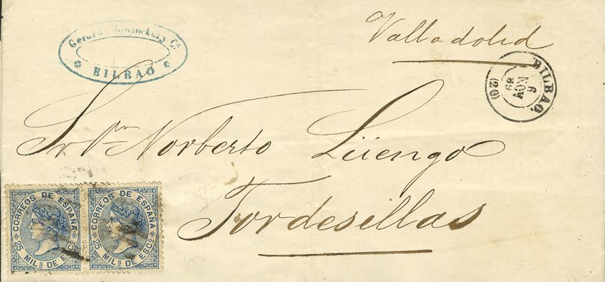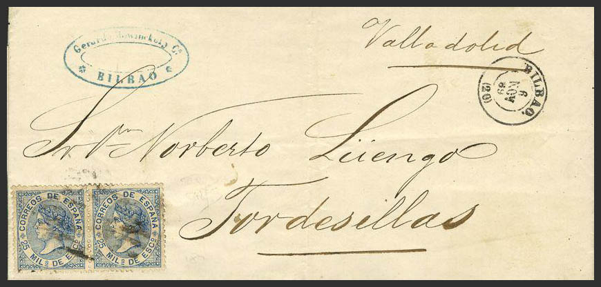 97(2). 1869. 25 mils azul, pareja. BILBAO a TORDESILLAS. MAGNIFICA Y RARA COMBINACION PARA COMPLETAR LA TARIFA DE 50 MILS.