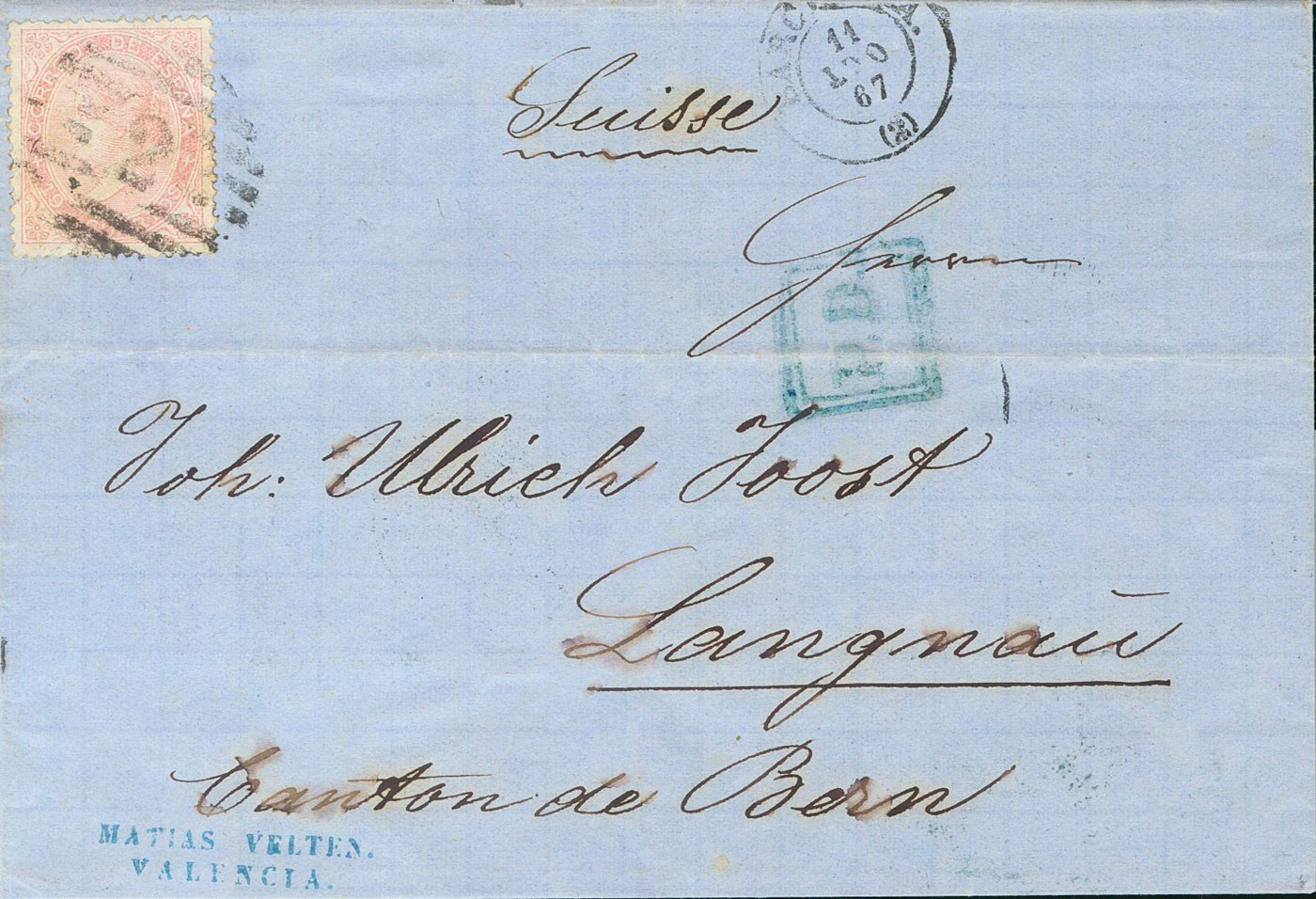 90. 1867. 19 cuartos rosa. BARCELONA a LANGNAU (SUIZA). Matasello PARRILLA CON Nº2. MAGNIFICA Y RARISIMA, A PARTIR DEL 1 DE FEBRERO DE 1866 LA TARIFA A SUIZA SE IGUALO CON LA TARIFA A BELGICA QUE ERA DE 19 CUARTOS, SON MUCHO MAS RARAS LAS CARTAS CIRCULADAS A SUIZA QUE A BELGICA CON ESTA TARIFA QUE SOLO ESTUVO EN VIGOR HASTA EL 31 DE OCTUBRE DE 1867, UNA DE LAS TARIFAS MAS RARAS POR LA BREVEDAD DE SU APLICACION QUE FUERON SOLO NUEVE MESES.