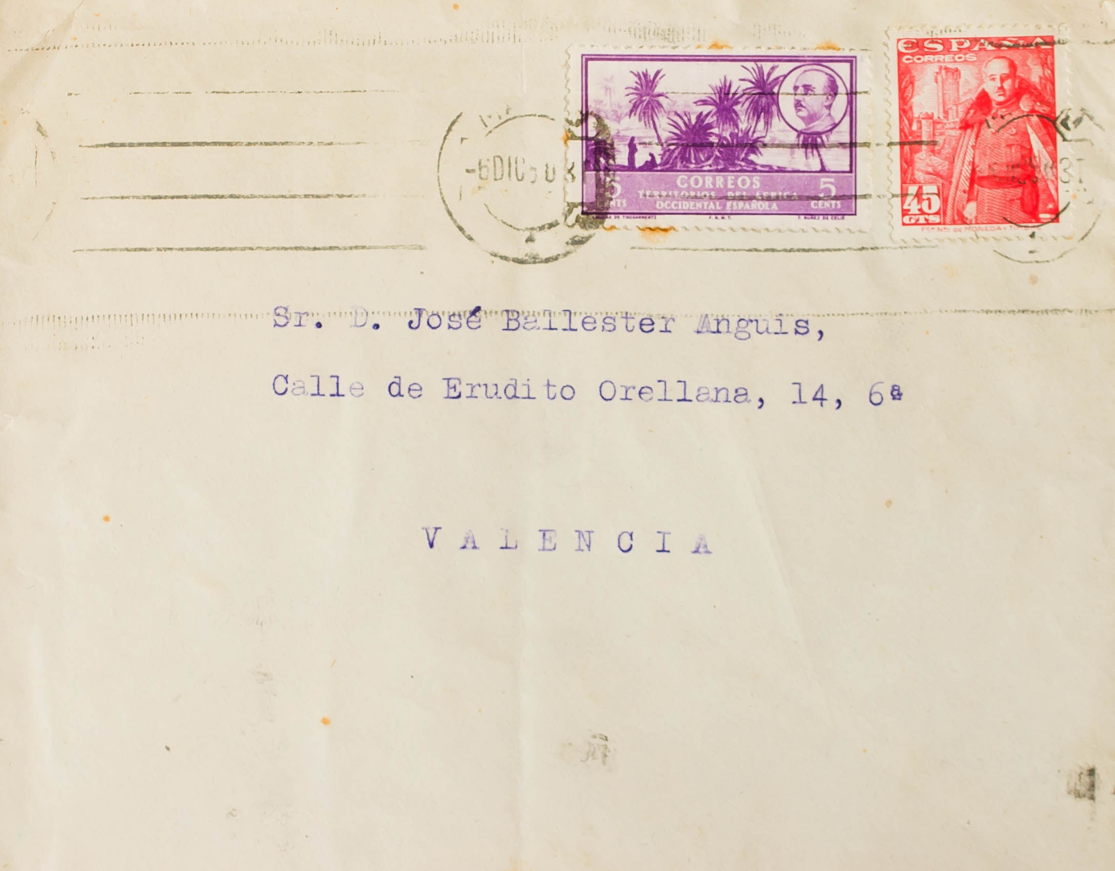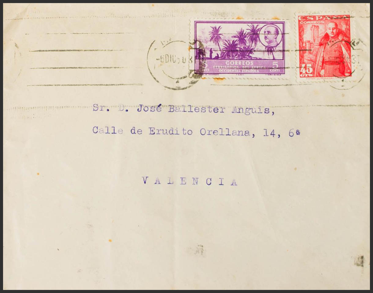 1028A. 1950. 45 cts rojo y 5 cts violeta de Africa Occidental. MADRID a VALENCIA. BONITA Y RARISIMO USO DE SELLOS DE COLONIAS EN LA PENINSULA.