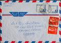 56(2). 1960. 4 pts ultramar, dos sellos y 1 pts naranja de España, dos sellos. ANDORRA LA VIEJA a LONDON (CANADA). MAGNIFICA.