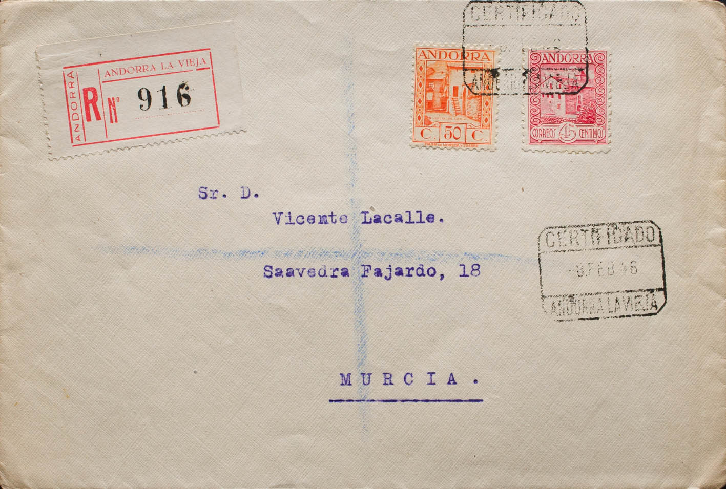 38, 39. 1946. 45 cts rosa y 50 cts naranja. Certificado de ANDORRA LA VIEJA a MURCIA. Al dorso tránsito. MAGNIFICA.