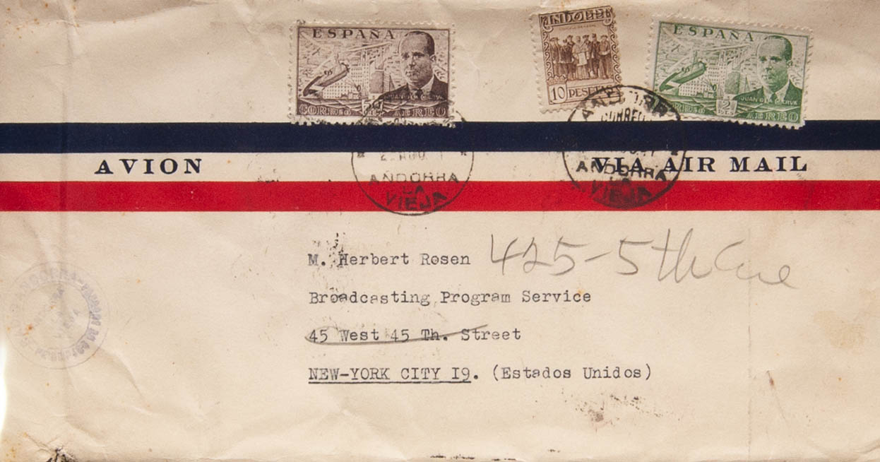 43. 1947. 10 pts castaño y sellos de España de 50 cts y 2 pts. ANDORRA LA VIEJA a NUEVA YORK (U.S.A.). Al dorso tránsito. MAGNIFICA.