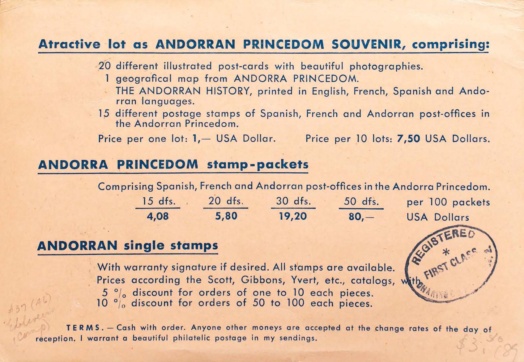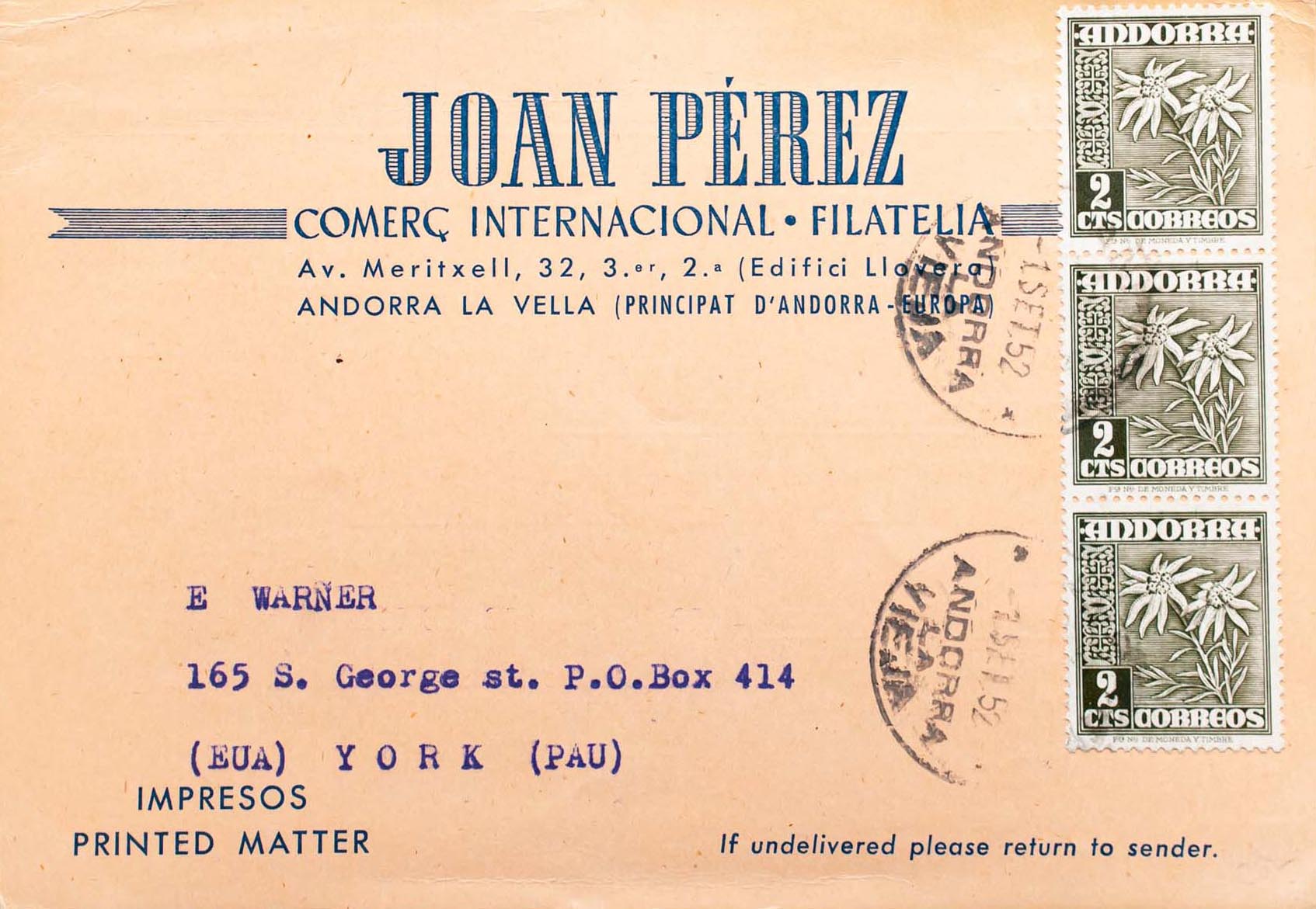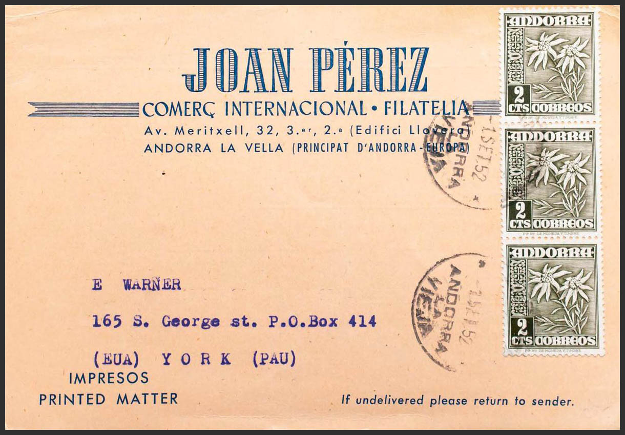 Andorra. Joan Pérez, comerciante filatélico. Dirigida a NUEVA YORK, al dorso llegada. MAGNIFICA.