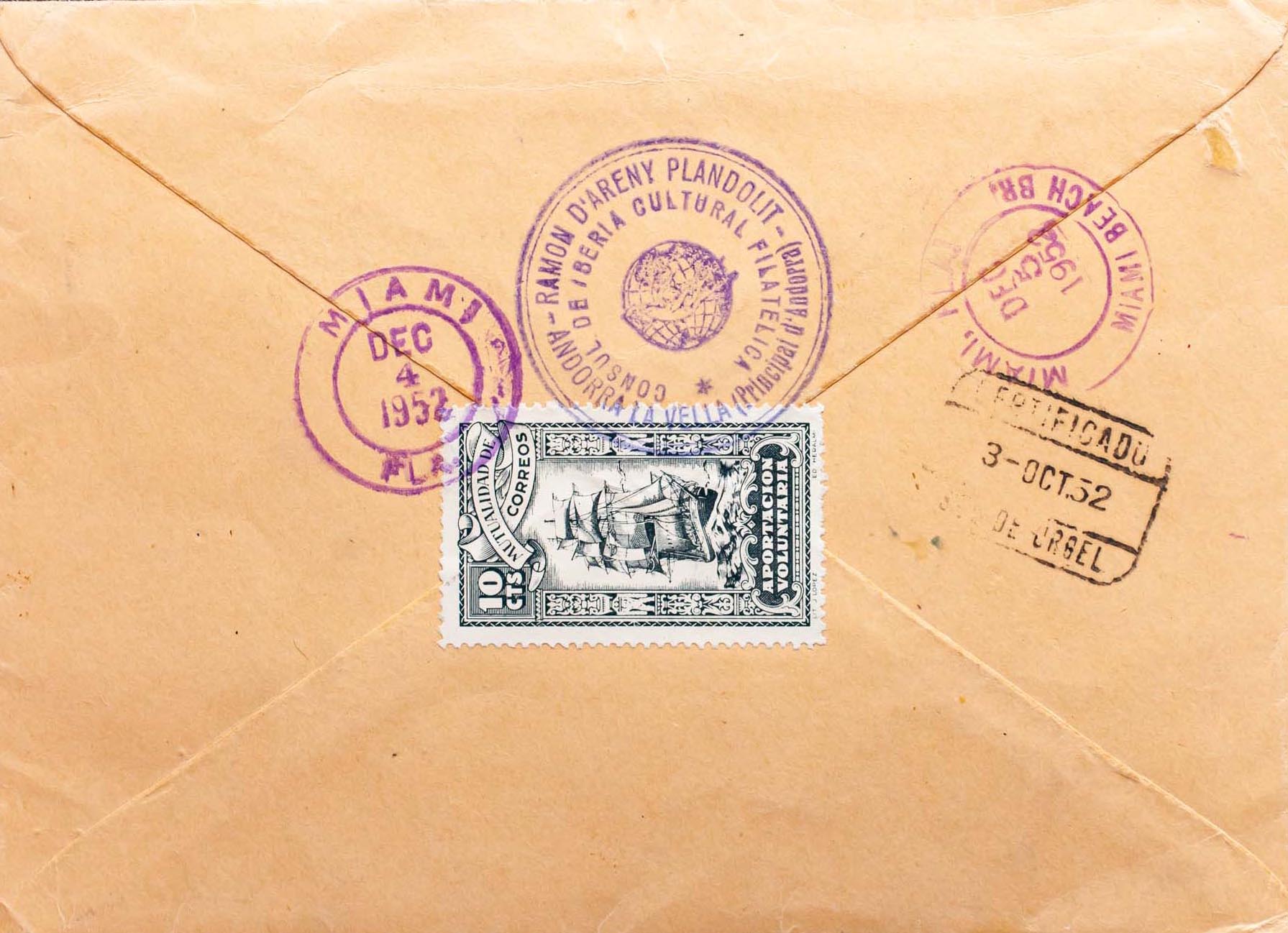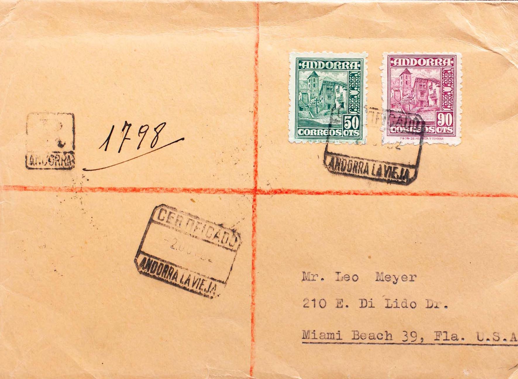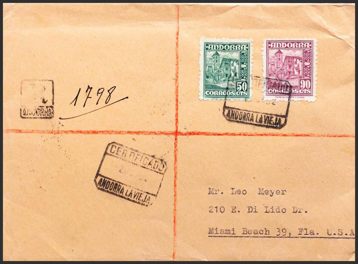 Andorra. Certificado dirigido a MIAMI, al dorso llegada. MAGNIFICA.