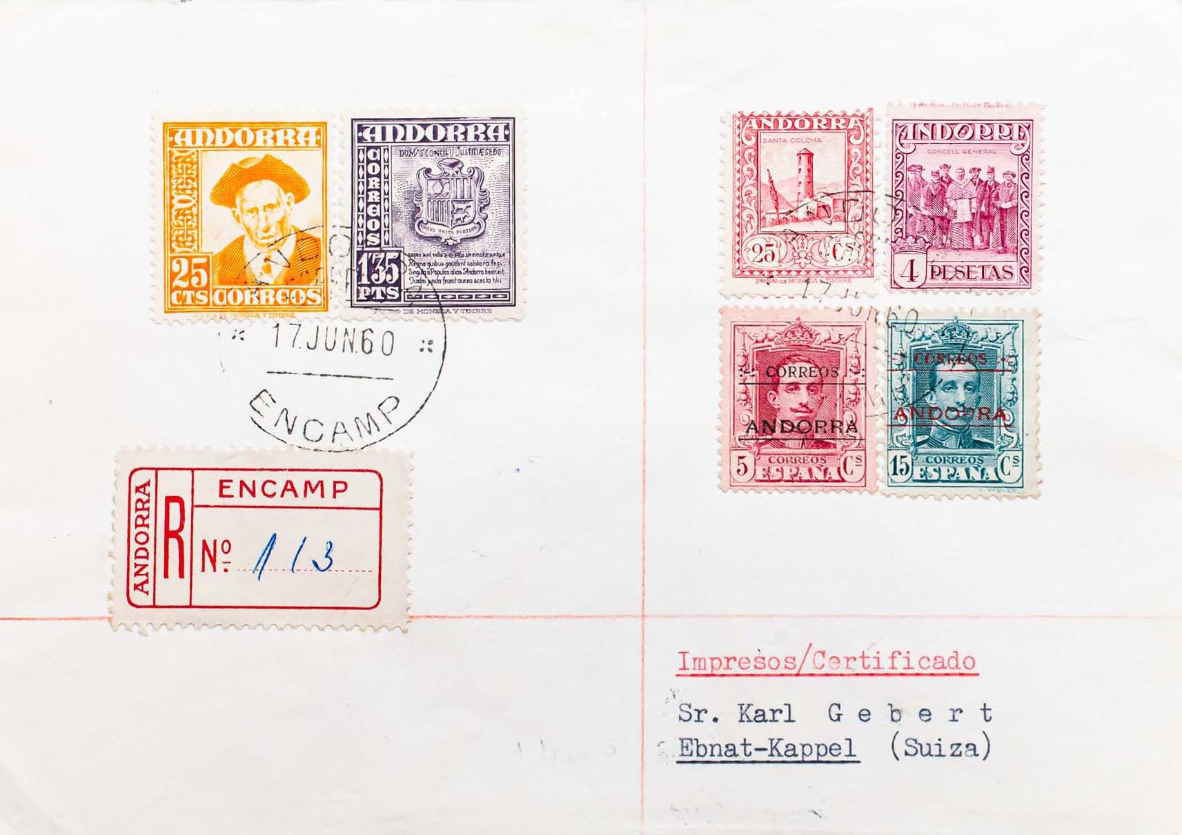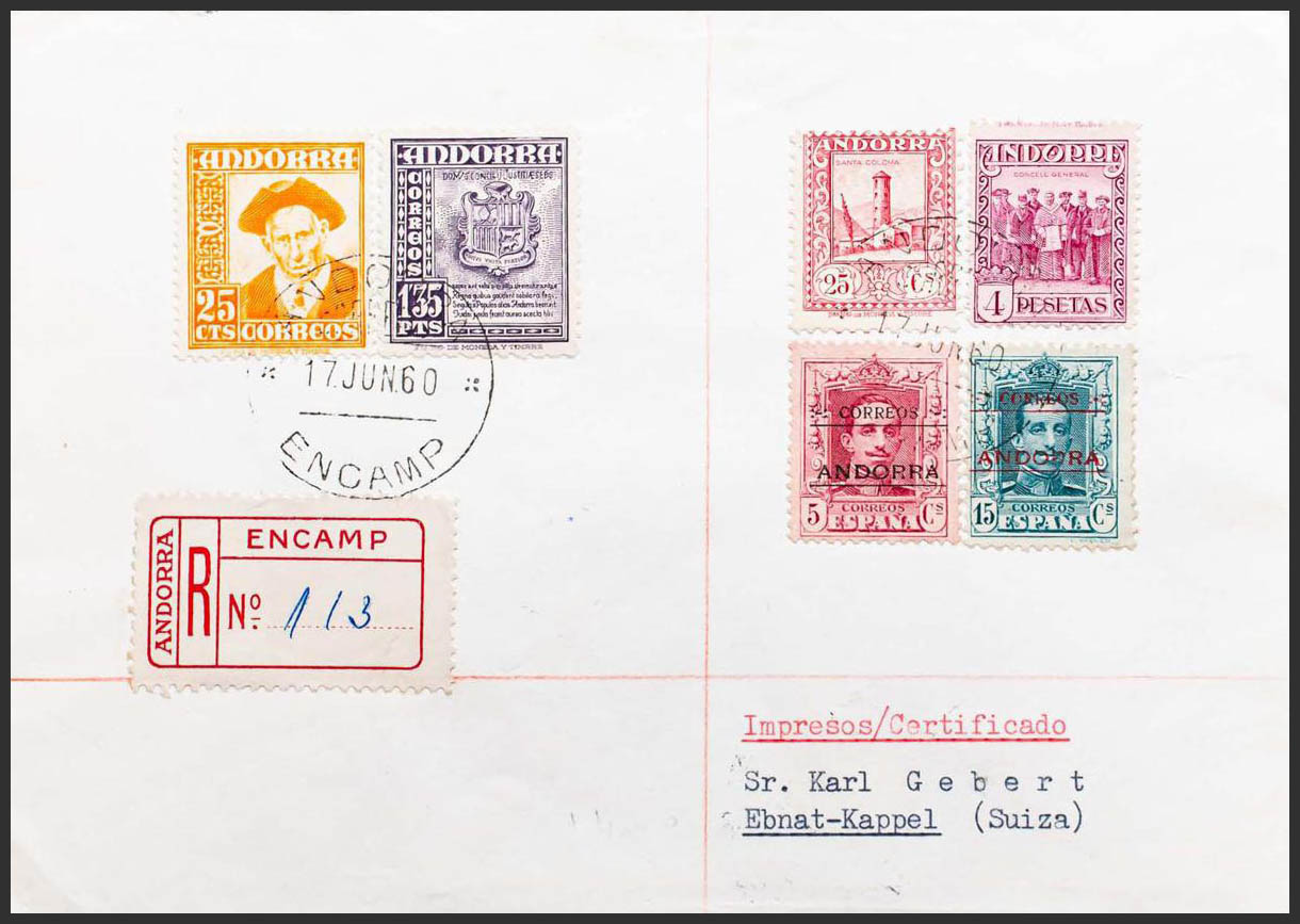 Andorra. ENCAMP / ANDORRA. Certificado dirigido a SUIZA, al dorso llegada. MAGNIFICA Y ESPECTACULAR.