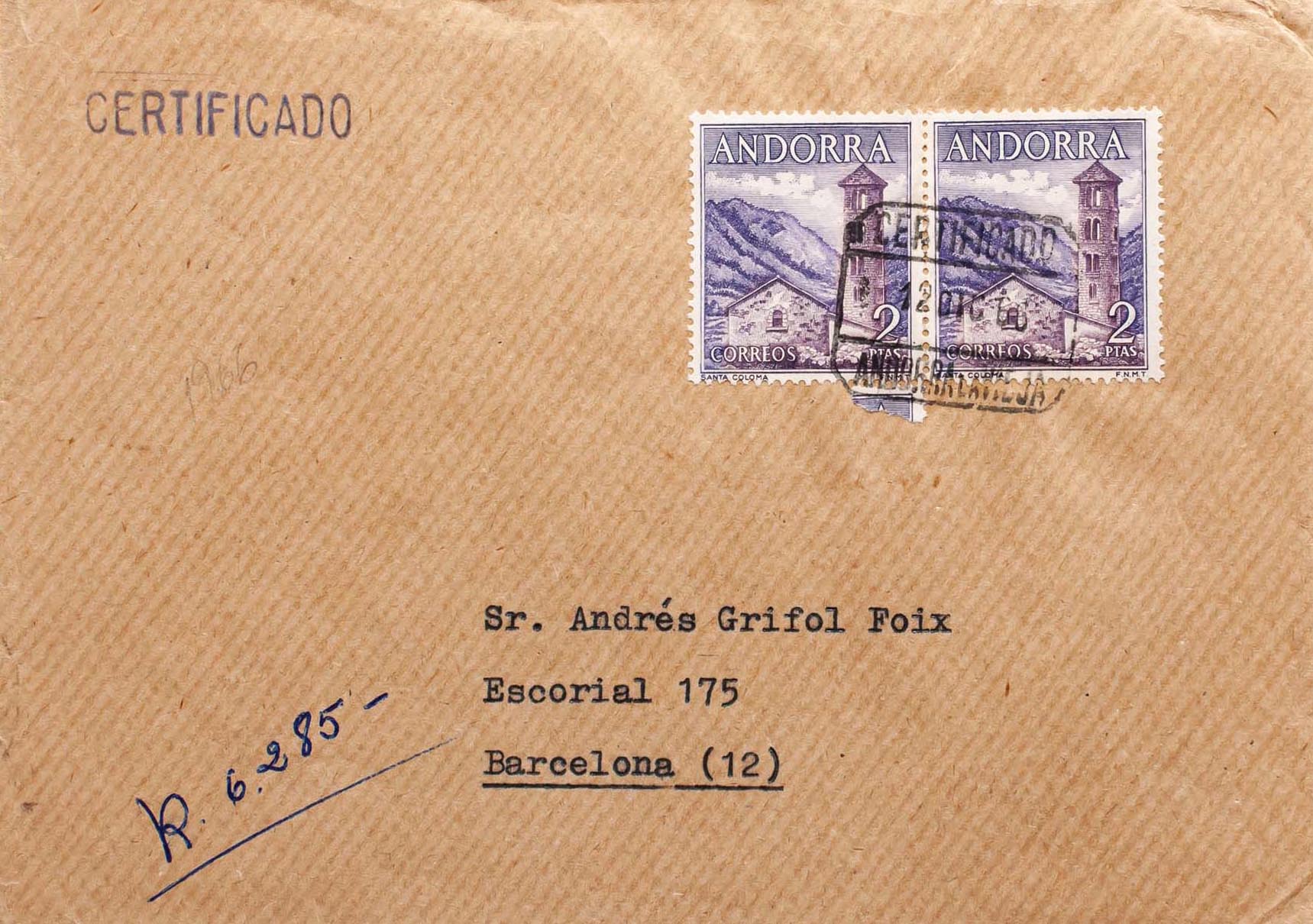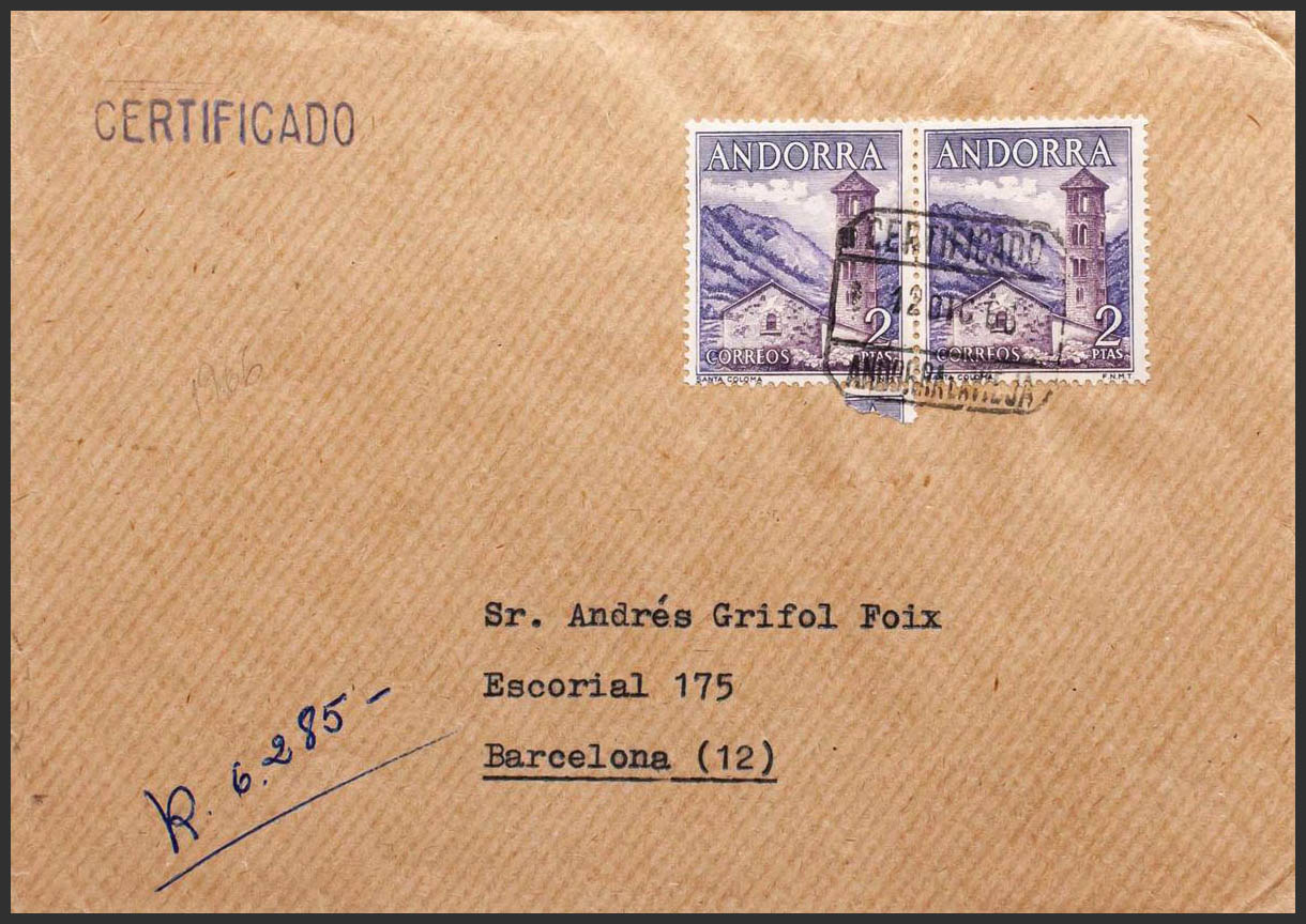 Andorra. CERTIFICADO / ANDORRA LA VIEJA, al dorso llegada. MAGNFICA.