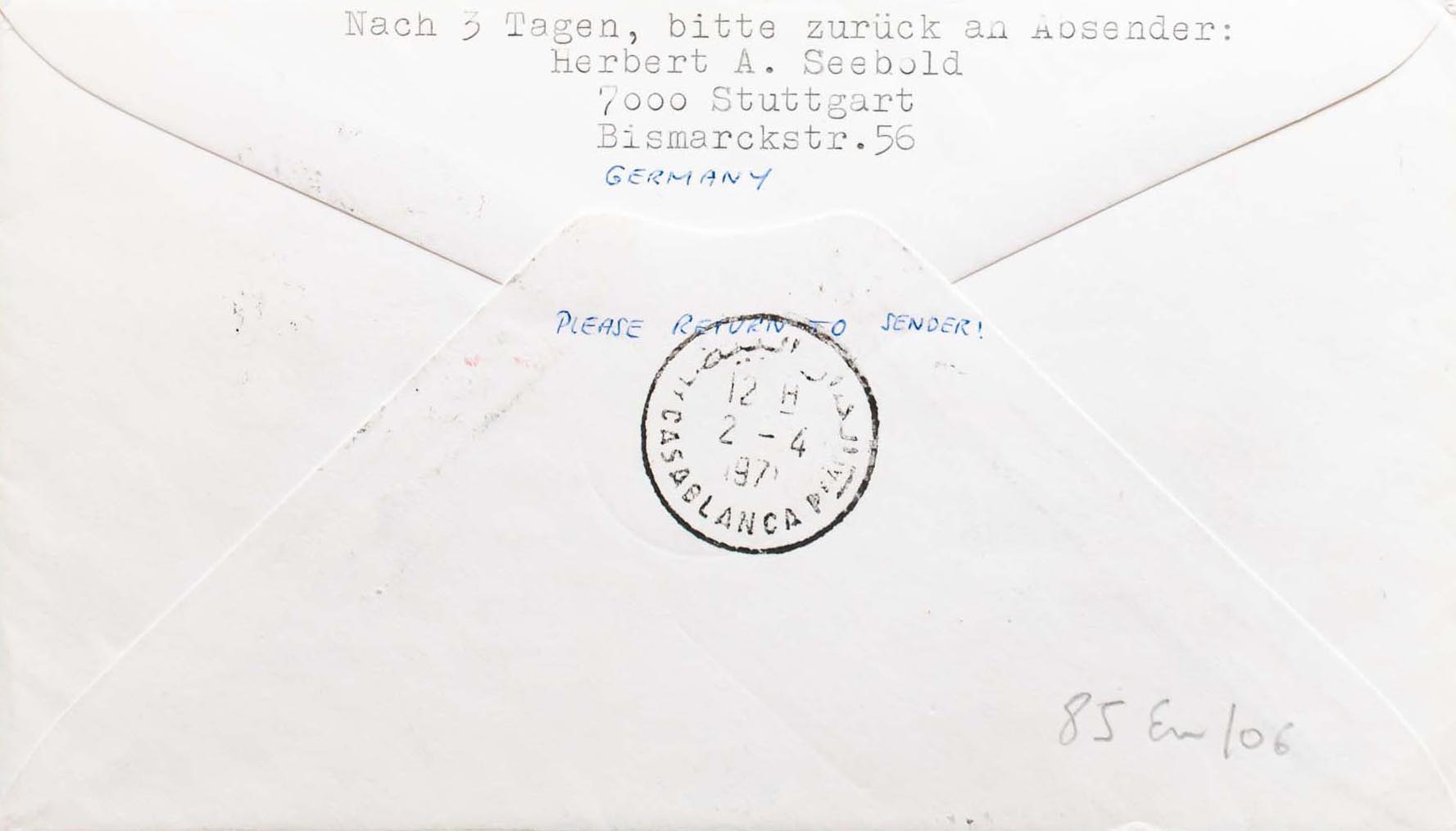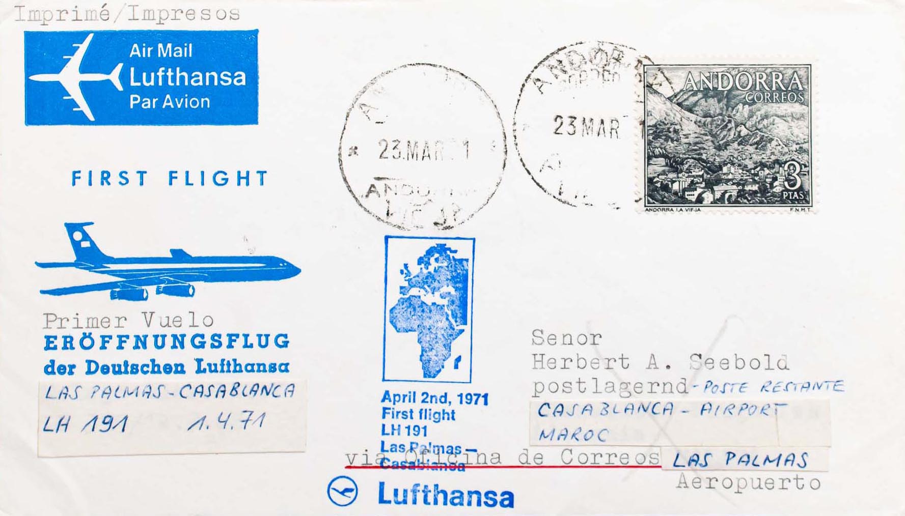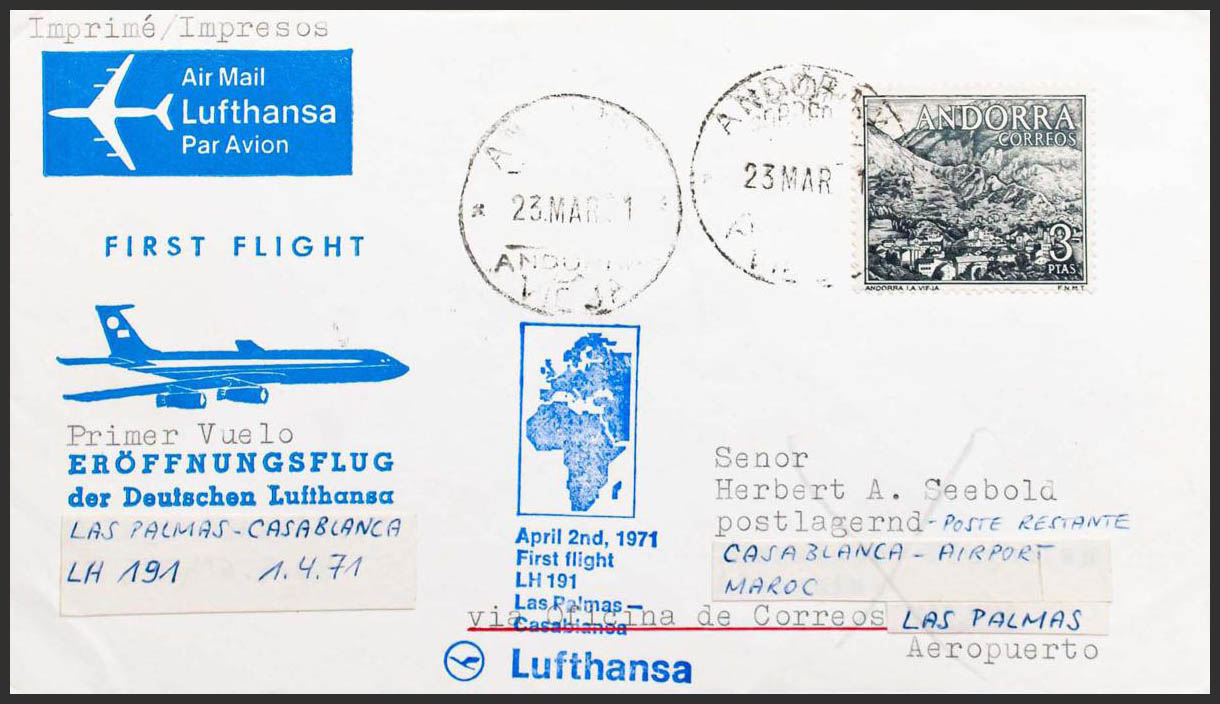 Andorra. 1º VUELO LAS PALMAS-CASABLANCA, al dorso llegada. MAGNIFICA.