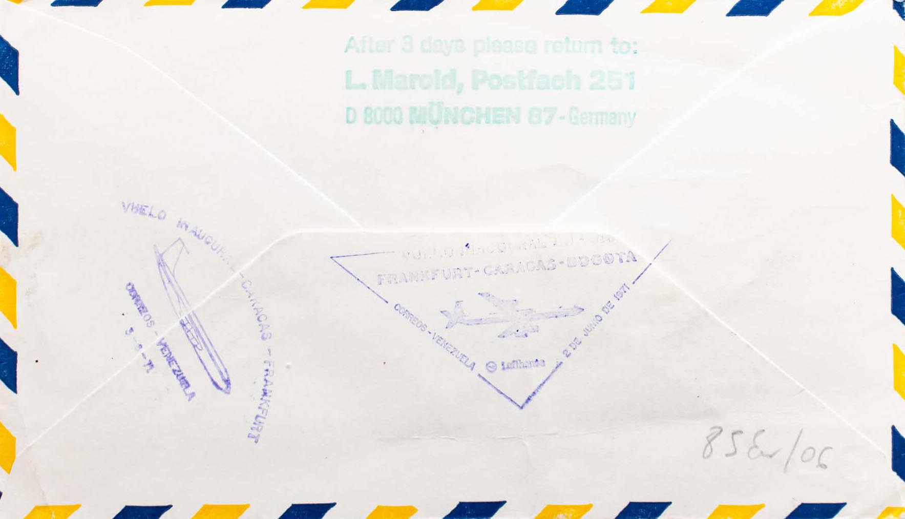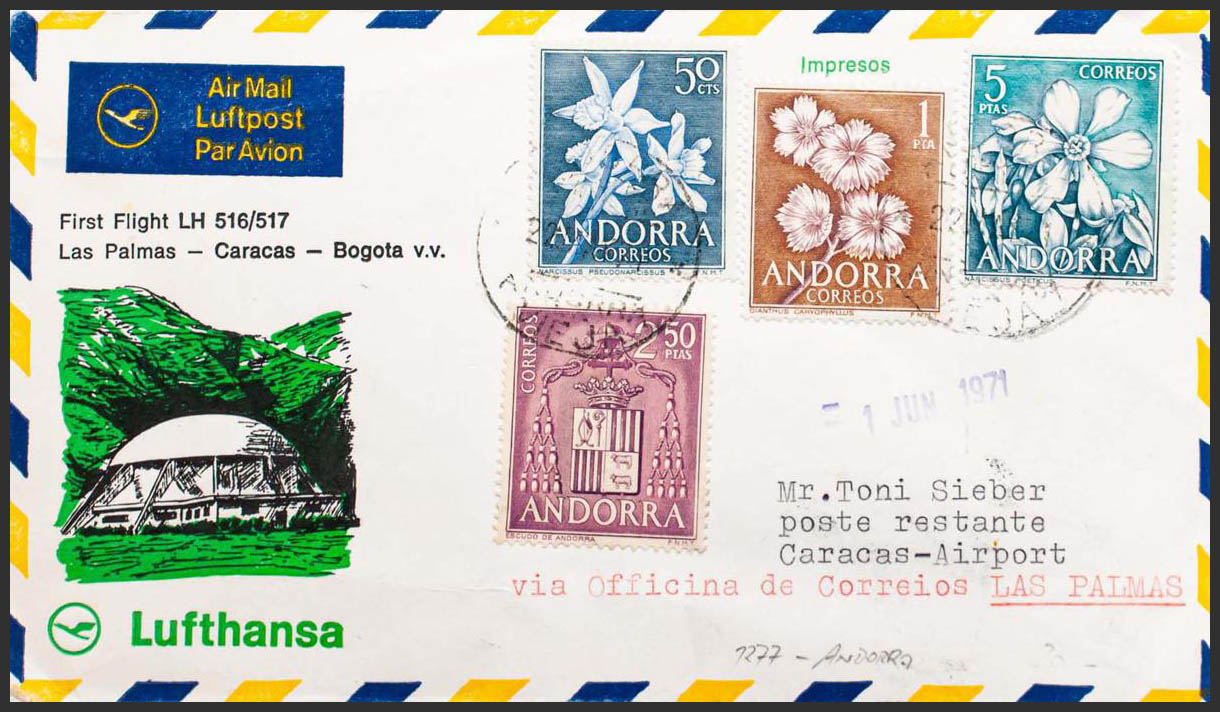 Andorra. 1º VUELO LAS PALMAS-CARACAS-BOGOTA, al dorso marca especial del vuelo. MAGNIFICA.