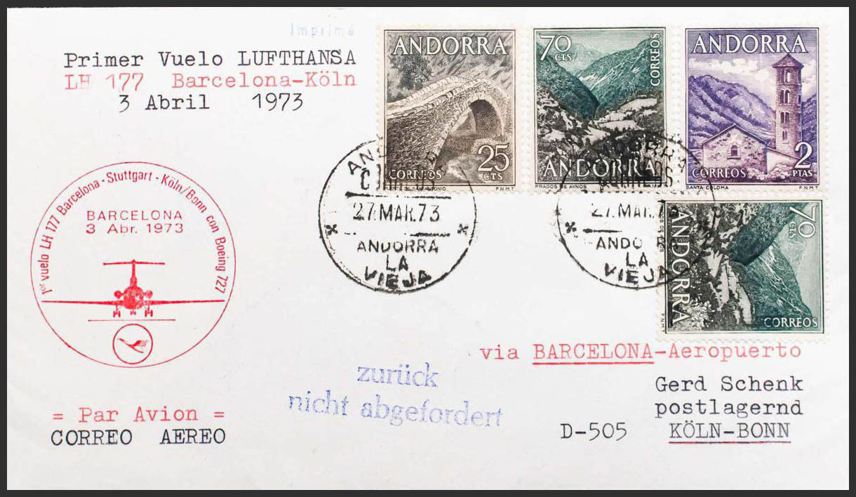 Andorra. 1º VUELO BARCELONA-COLONIA, en el frente marca especial del vuelo y al dorso llegada. MAGNIFICA.