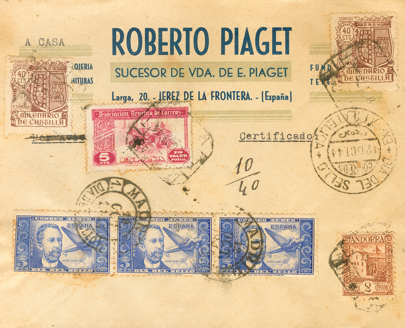 983(3), 981(2). 1944. 5 pts ultramar, tres sellos, 40 cts castaño, Benéfico de 5 cts y sello de Andorra de 2 cts castaño. Certificado de MADRID a JEREZ DE LA FRONTERA. Al dorso llegada. MAGNIFICA Y RARO FRANQUEO MIXTO CON UN SELLO DE ANDORRA.