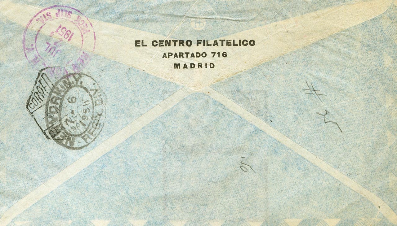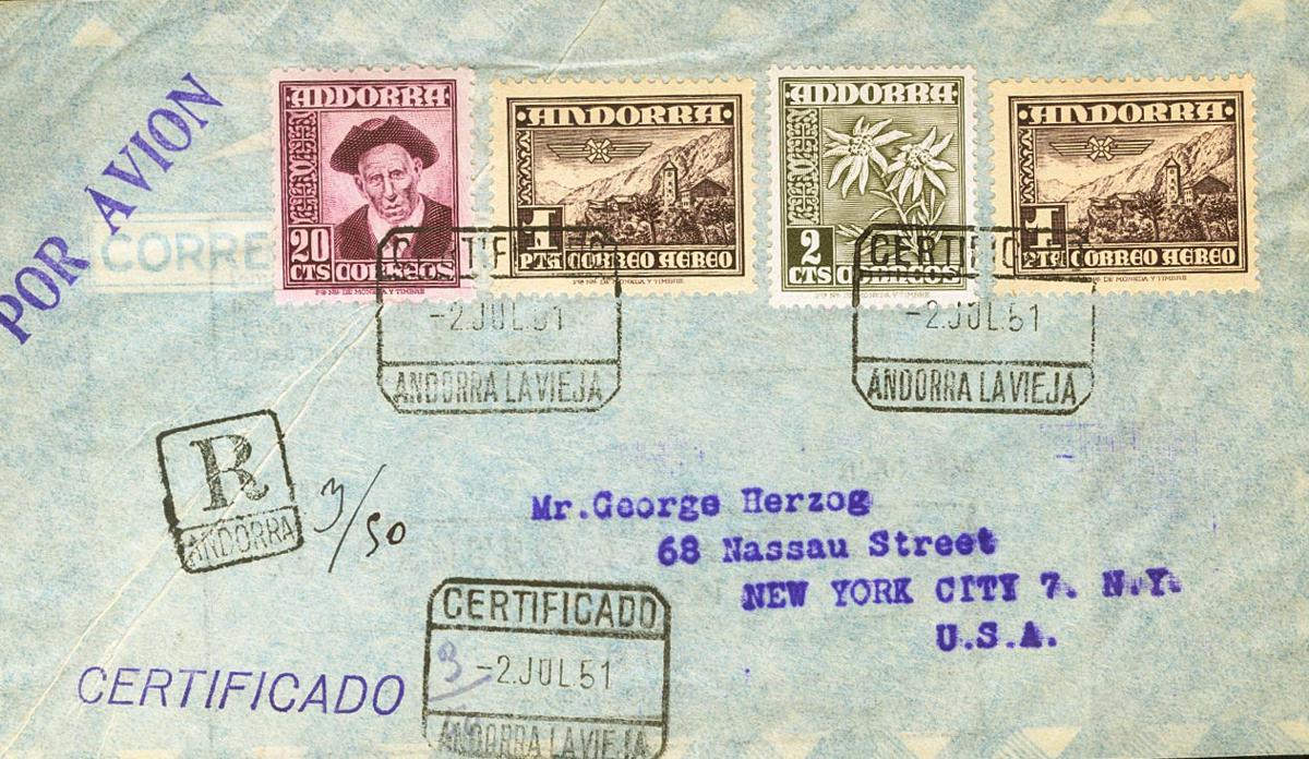 45, 48, 59(2). 1951. 2 cts oliva, 20 cts lila castaño y 1 pts violeta. Certificado de ANDORRA LA VIEJA a NUEVA YORK (U.S.A.). Al dorso llegada. MAGNIFICA.