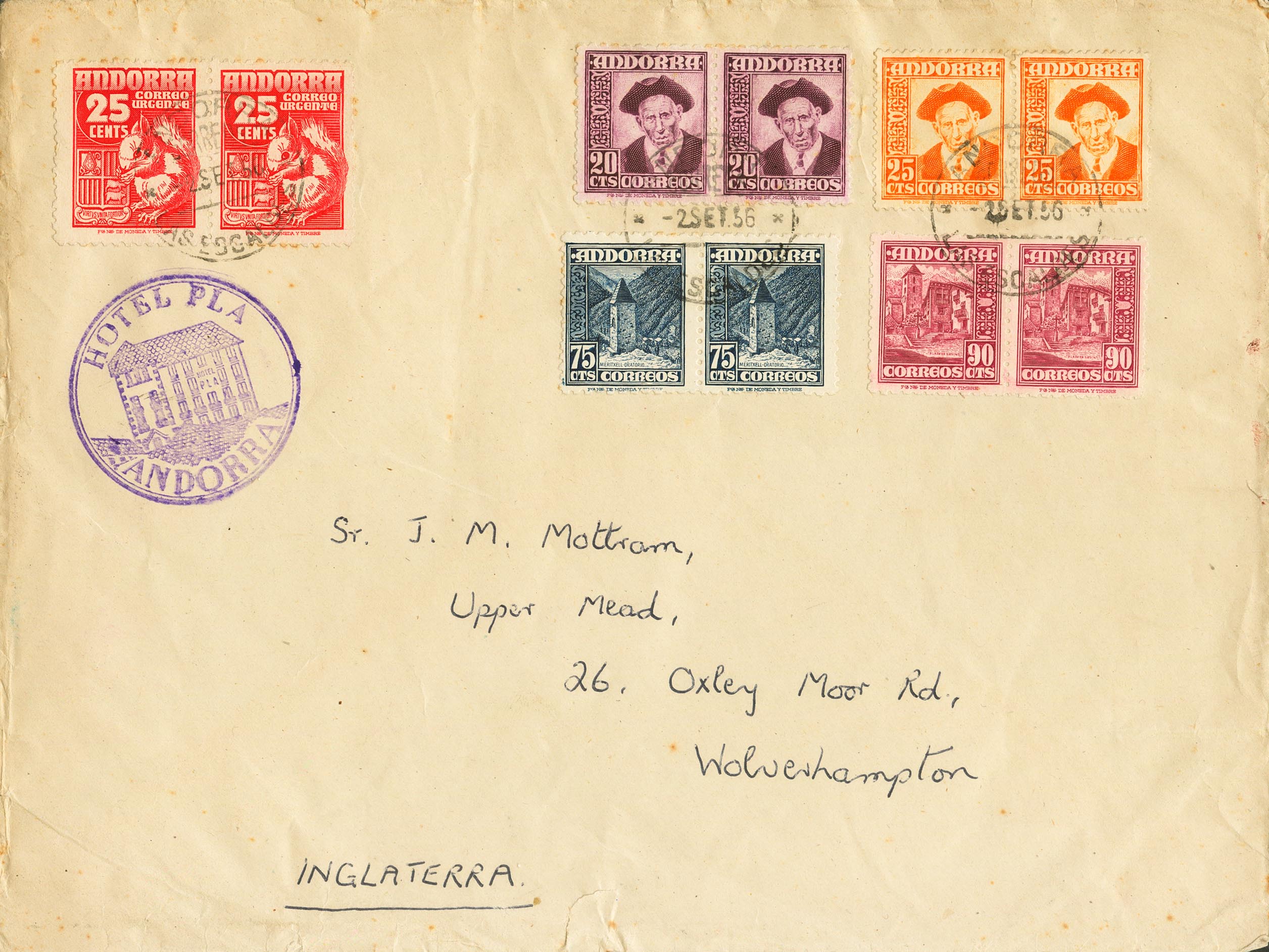 48/49(2), 52/53(2), 58(2). 1956. 20 cts lila, 25 cts naranja, 75 cts azul, 90 cts lila y 25 cts rojo, en parejas. ESCALDES a WOLVERHAMPTON (GRAN BRETAÑA). MAGNIFICA.