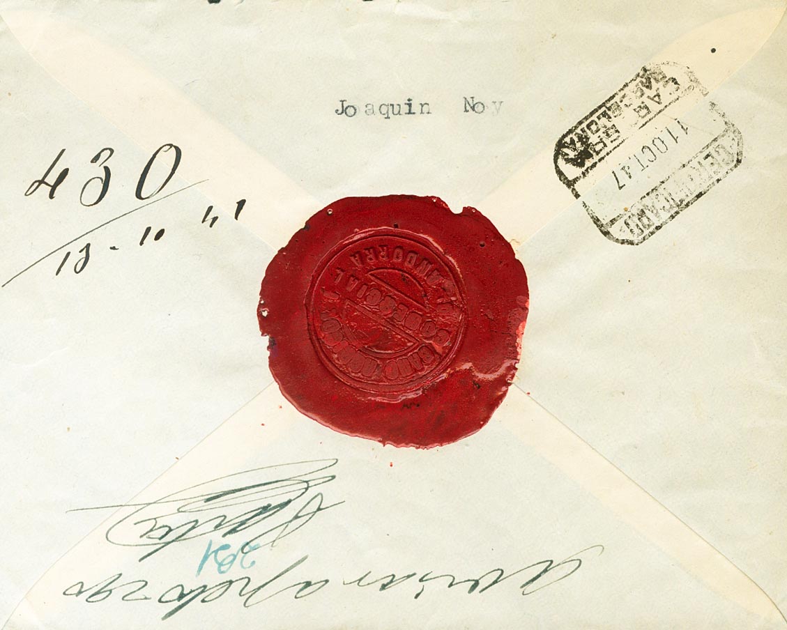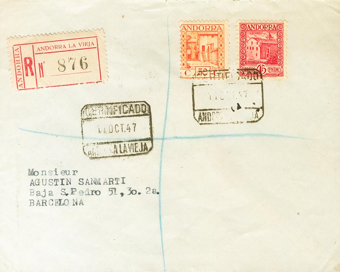 38, 39. 1947. 45 cts rojo y 50 cts naranja. Certificado de ANDORRA LA VIEJA a BARCELONA. Al dorso llegada. MAGNIFICA.
