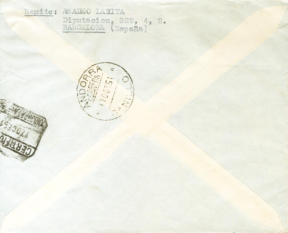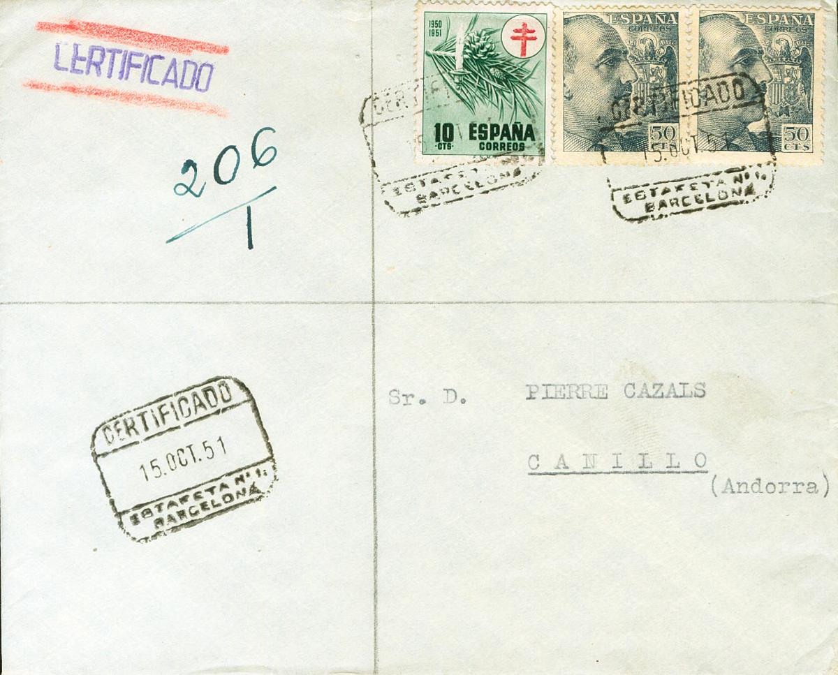 1085, 1053(2). 1951. 10 cts verde y 50 cts gris, dos sellos. Certificado de BARCELONA a CANILLO (ANDORRA). Al dorso llegada. MAGNIFICA.