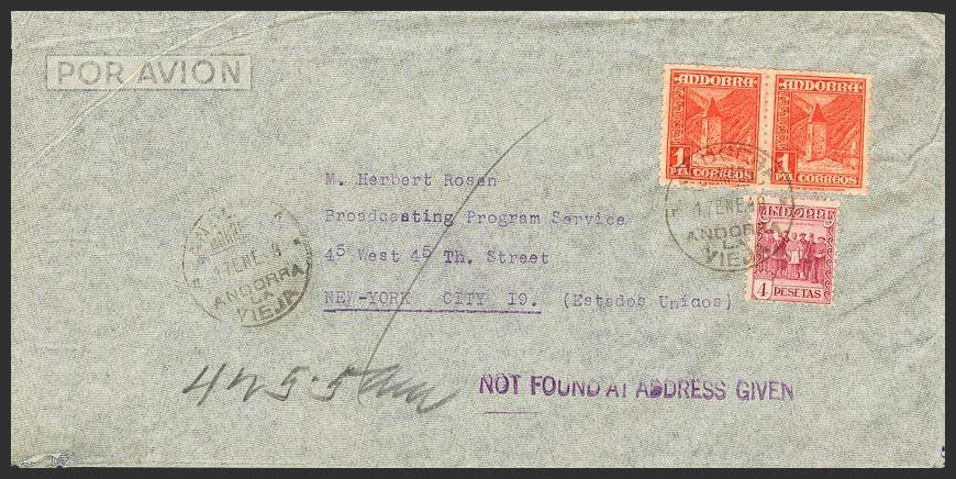 42, 54(2). 1949. 1 pts, pareja y 4 pts. Carta Aérea de ANDORRA LA VIEJA a NUEVA YORK. En el frente "NOT FOUND AT ADDRESS GIVEN". MAGNIFICA.