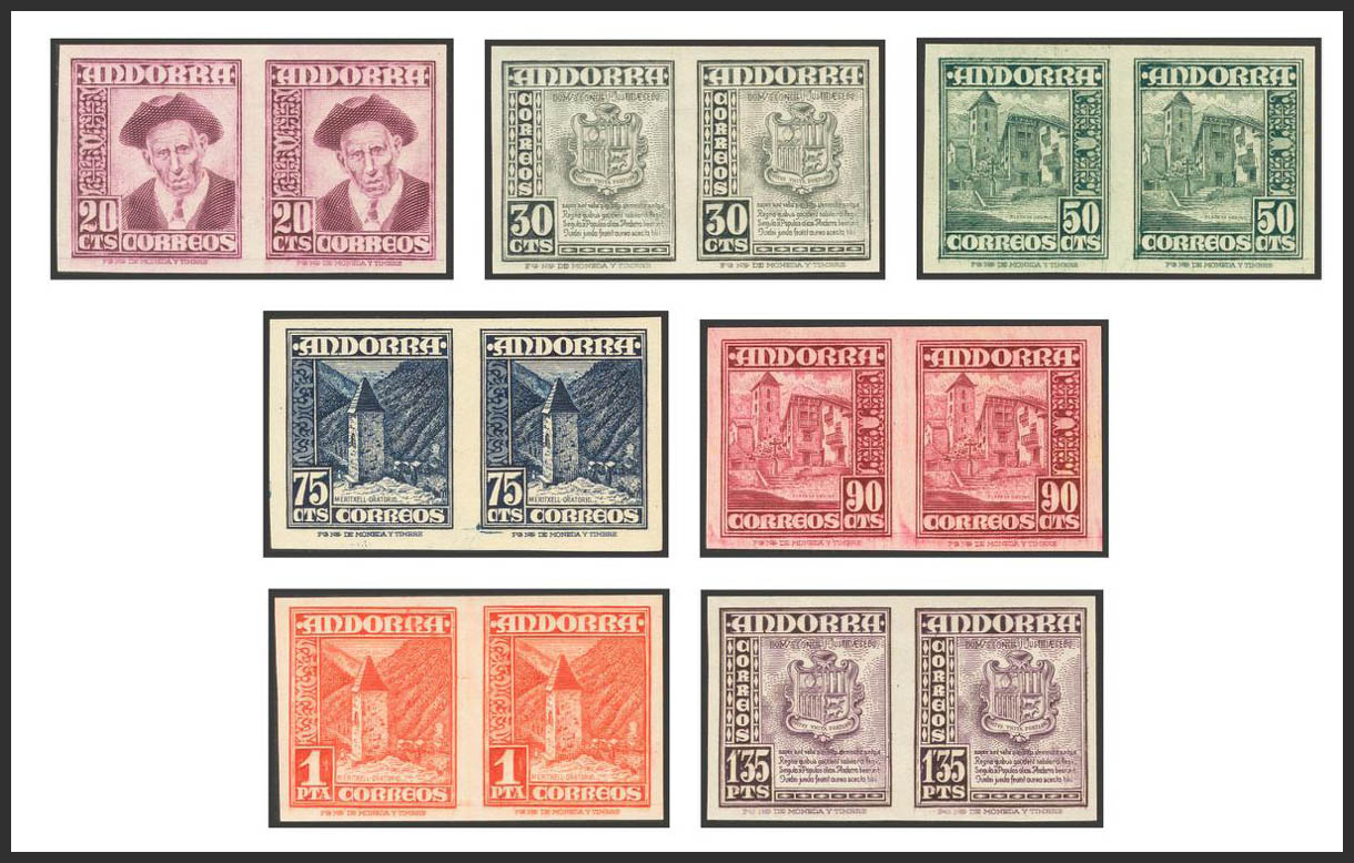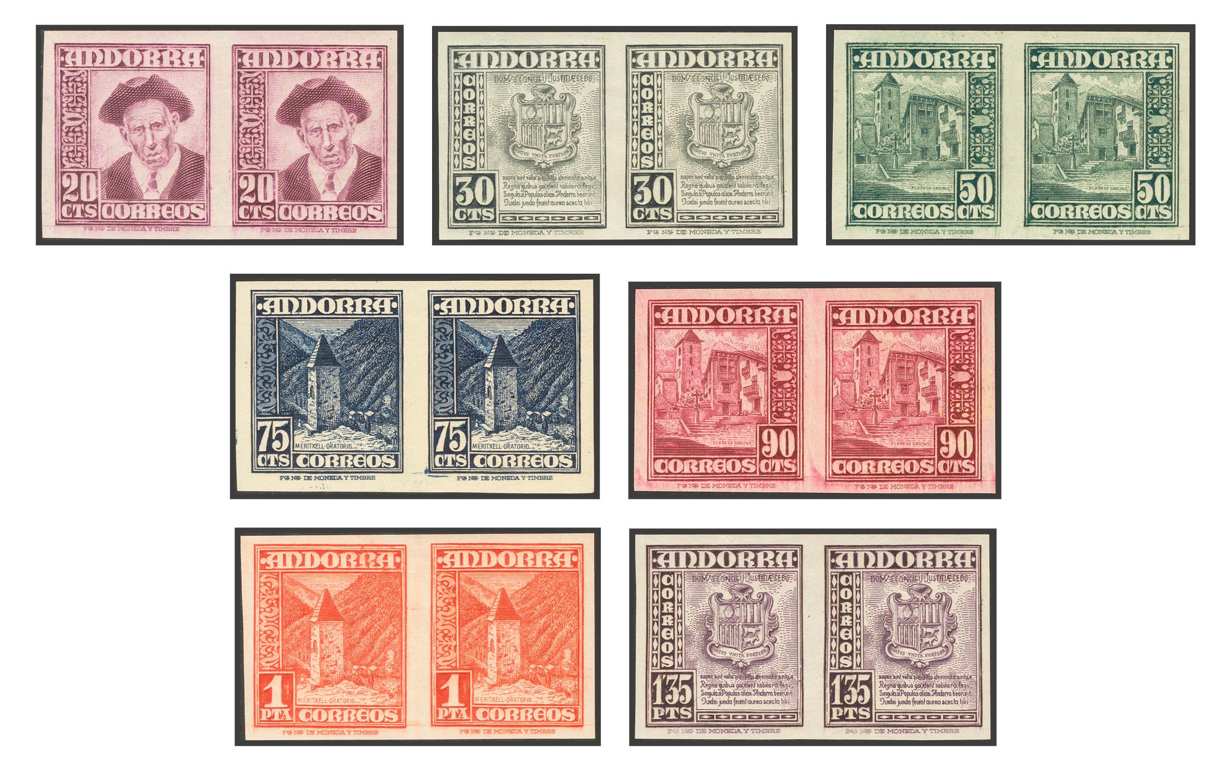 ★★ 45/55s(2). 1948. Serie completa, en pareja (el 4 pts no se conoce en pareja sin dentar y por lo tanto es muy fácil dudar de su existencia). SIN DENTAR. MAGNIFICA Y RARISIMA. Cert. CEM. Nota: los sellos de esta emisión tienen unos márgenes grandes y muy regulares debido a las modernas técnicas que a finales de los años cuarenta se utilizaban, aún no ofreciendo mucha complejidad desde el punto de vista de la expertización, nos parece muy recomendable poseer la serie completa en pareja sin dentar. Edifil 2019: +++4.550 Euros