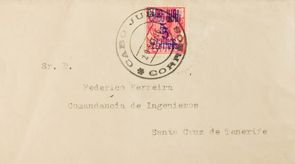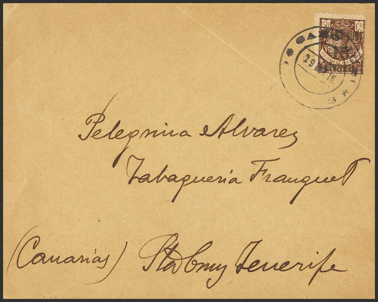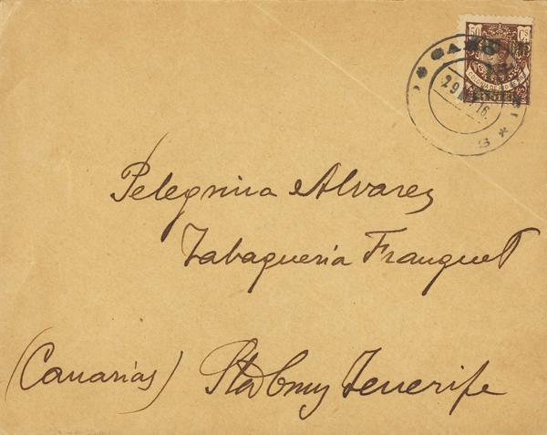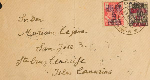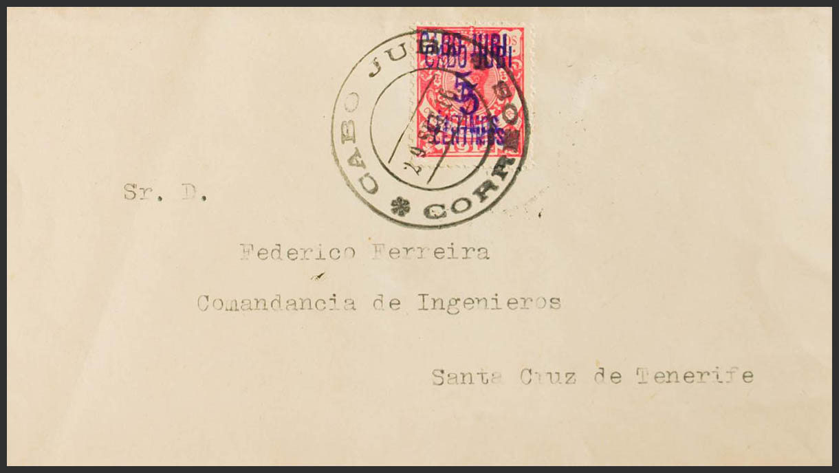 3. 1916. 15 cts sobre 50 cts castaño. Carta Filatélica de CABO JUBY a SANTA CRUZ DE TENERIFE. Al dorso llegada. MAGNIFICA.