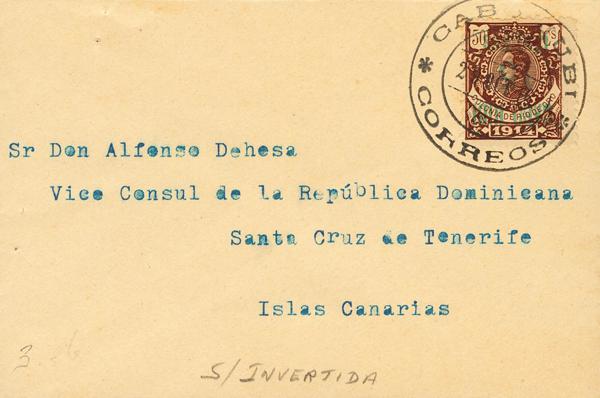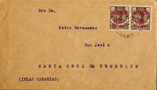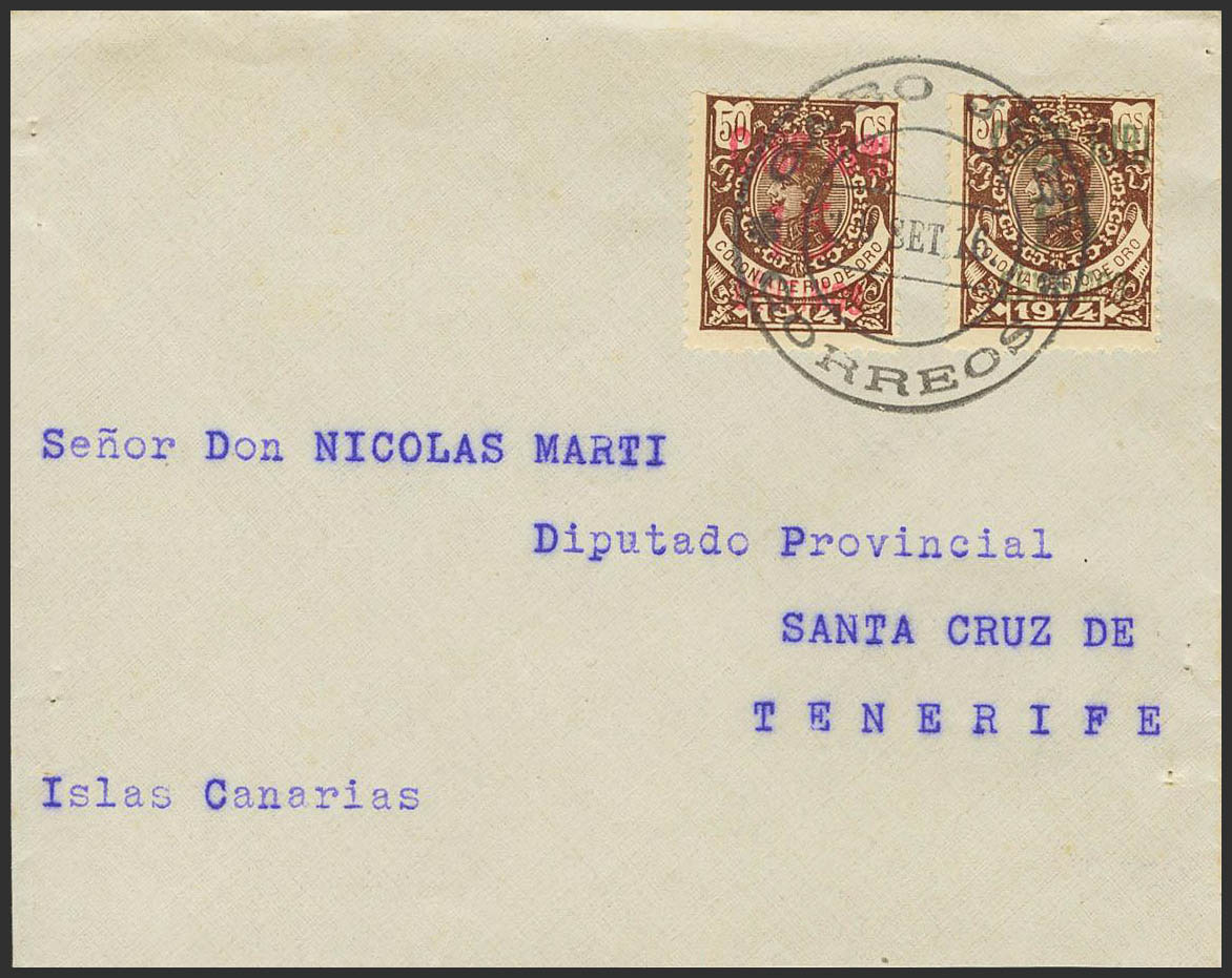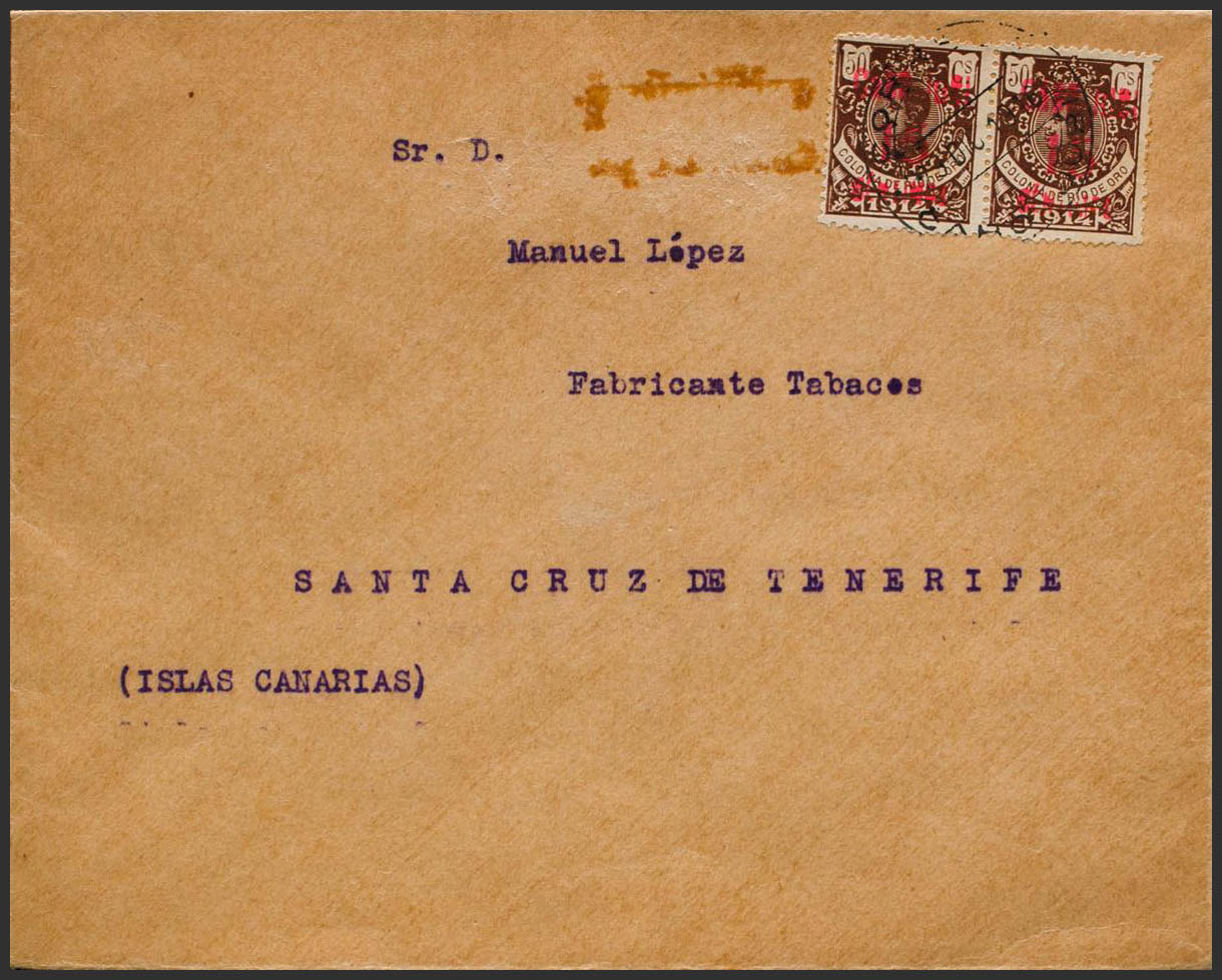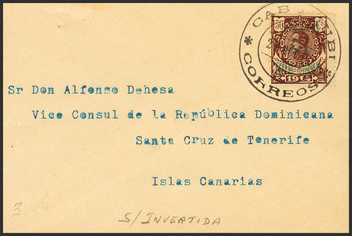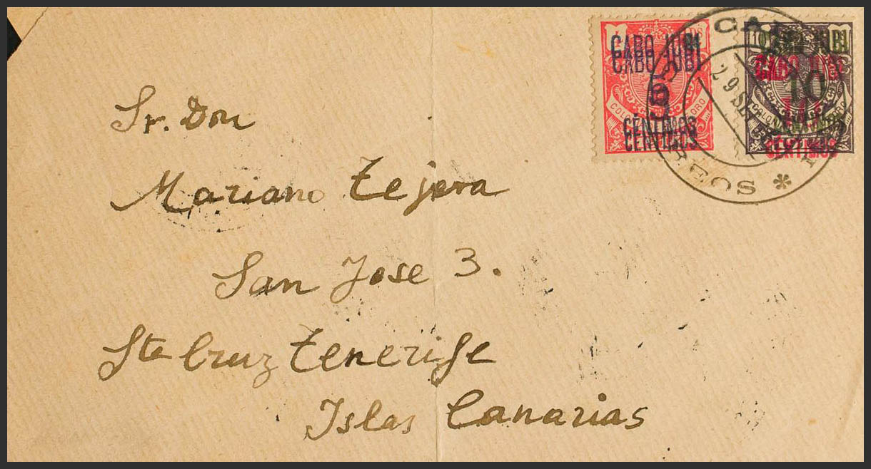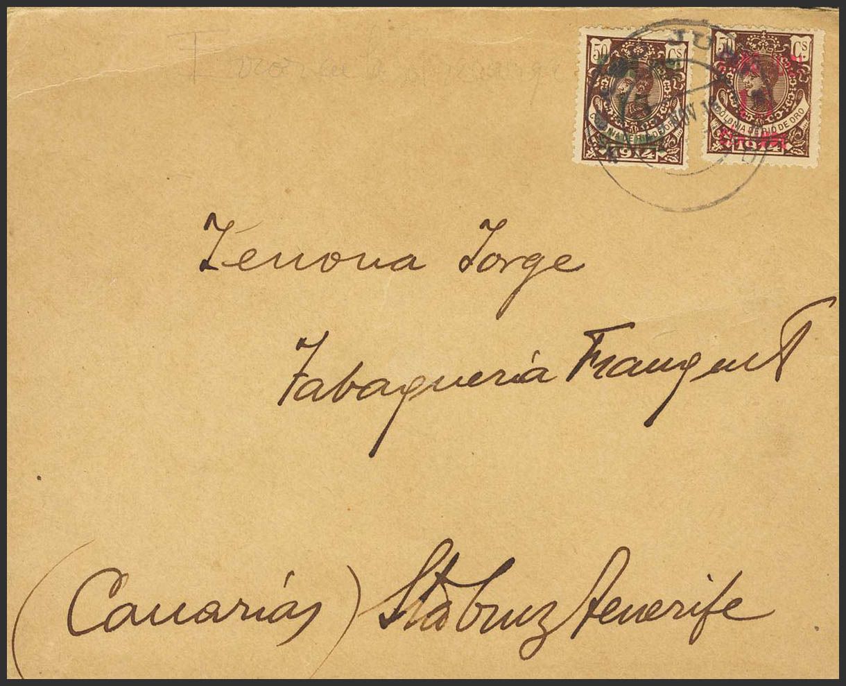 1hh, 2hh. 1916. 5 cts sobre 4 pts rosa SOBRECARGA DOBLE, 10 cts sobre 10 pts violeta SOBRECARGA DOBLE, en carmÃn y violeta. Carta Filatélica de CABO JUBY a SANTA CRUZ DE TENERIFE. Al dorso llegada. MAGNIFICA Y RARA. Dictamen GRAUS.