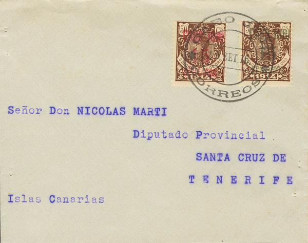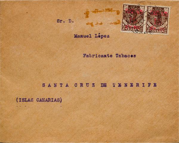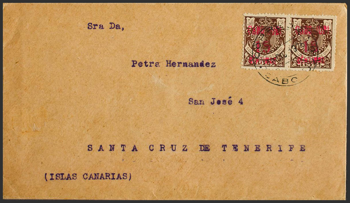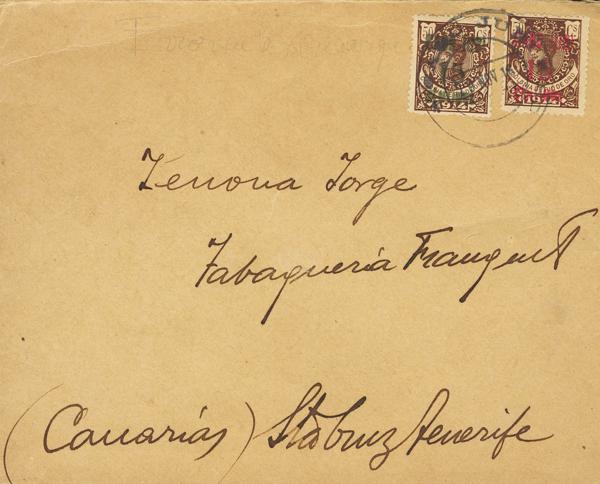 3(2). 1916. 15 cts sobre 50 cts castaño, dos sellos. Carta Filatélica de CABO JUBY a SANTA CRUZ DE TENERIFE. Al dorso llegada. MAGNIFICA.