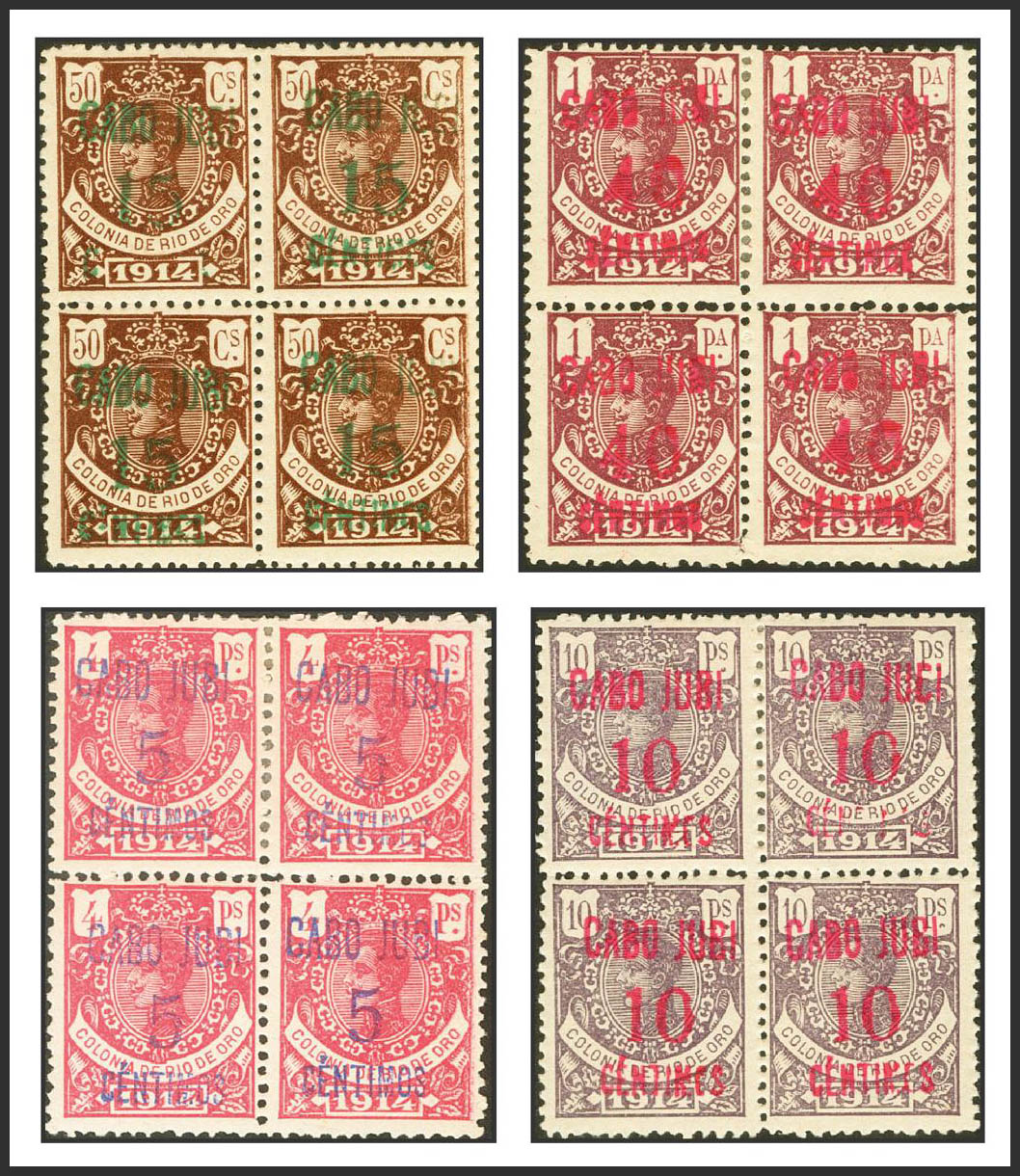 ★★/★ 1/2(4), 3A(4), 4(4). 1916. 5 cts sobre 4 pts rosa, 10 cts sobre 10 pts violeta, 15 cts sobre 50 cts castaño y 15 cts sobre 1 pts violeta, en bloques de cuatro (los sellos inferiores sin fijasellos). MAGNIFICOS Y RAROS EN BLOQUES. Edifil 2023: ++2.160 Euros