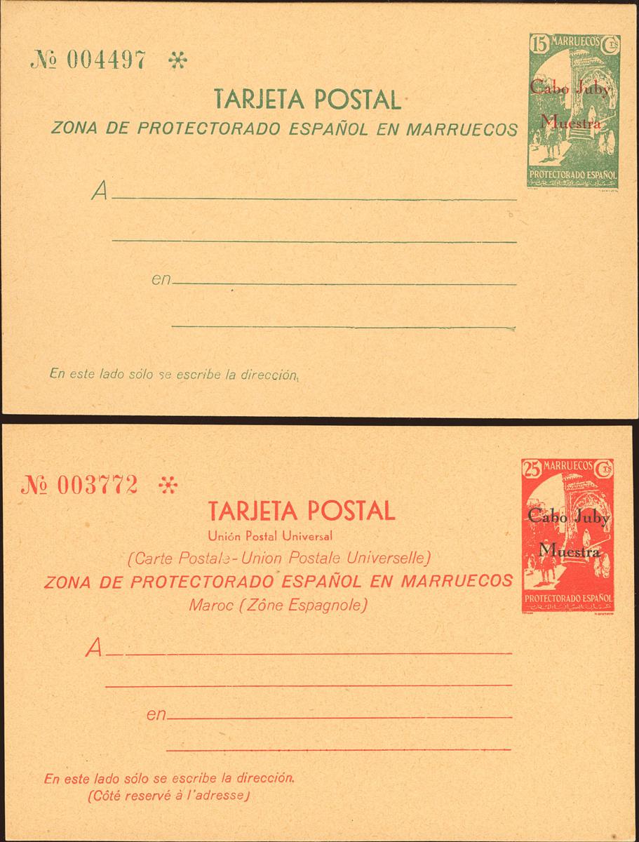 (★) 1/2M. 1933. 15 cts verde y 25 cts rojo sobre Tarjetas Entero Postales. MUESTRA. MAGNIFICAS Y RARAS. Edifil 2018: 810 Euros