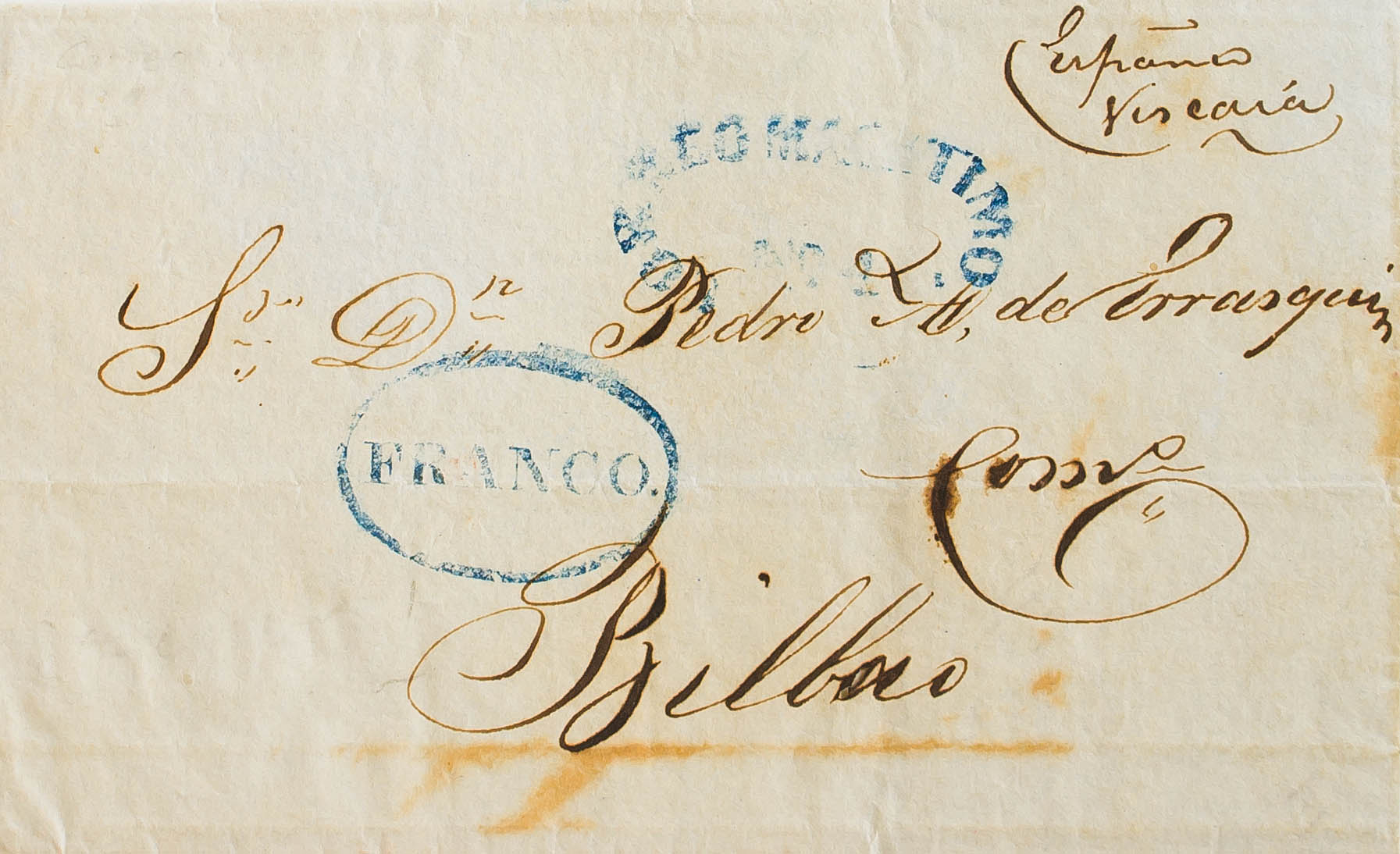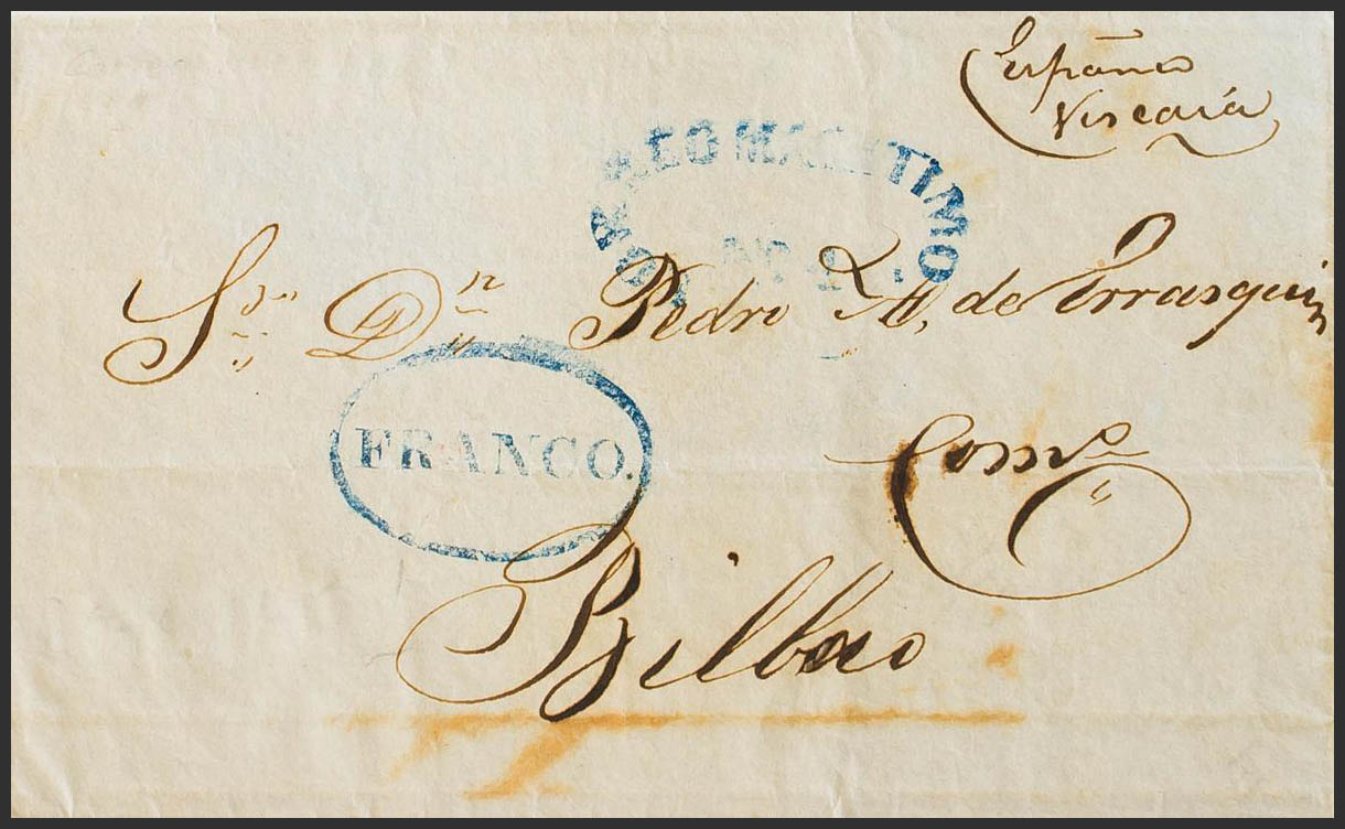 1845. LA HABANA a BILBAO. Marcas FRANCO y CORREO MARITIMO / Nº1, en azul (P.E.22 y P.E.44) edición 2004. MAGNIFICA Y RARA.