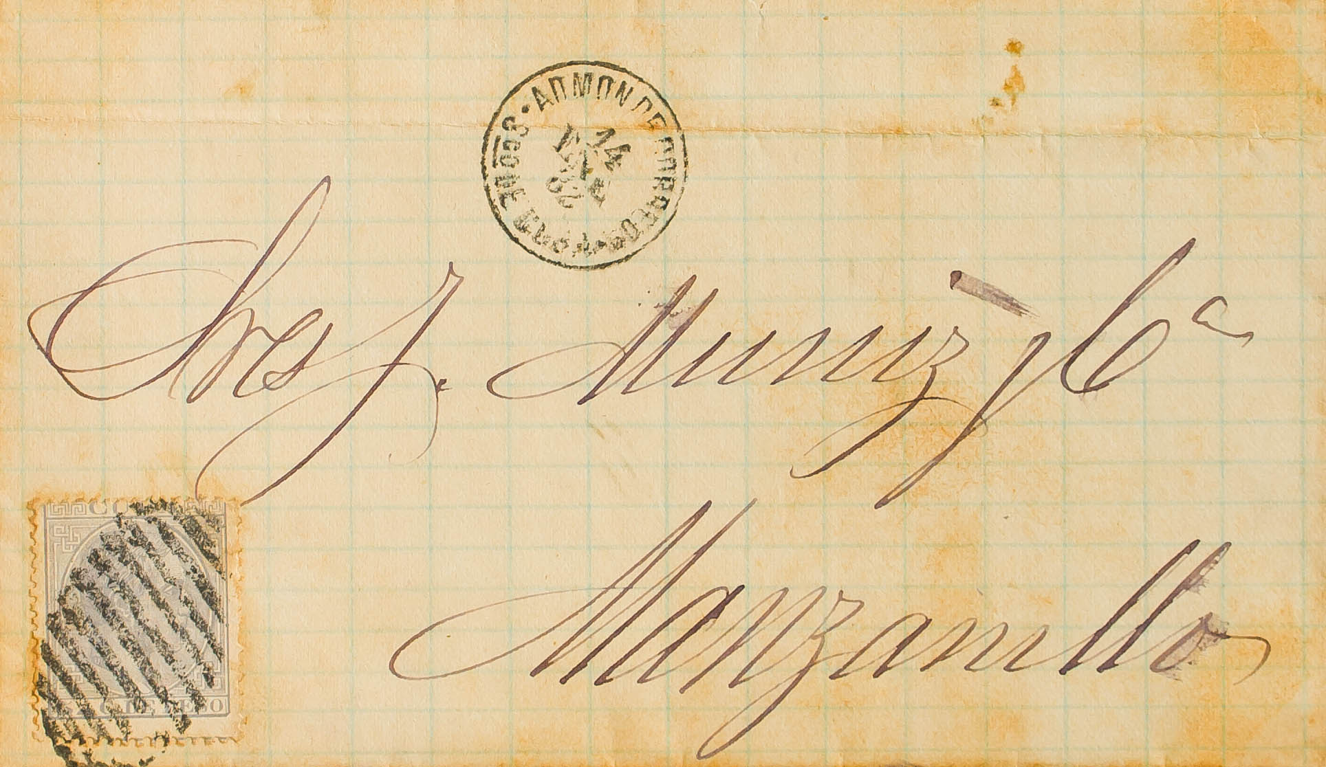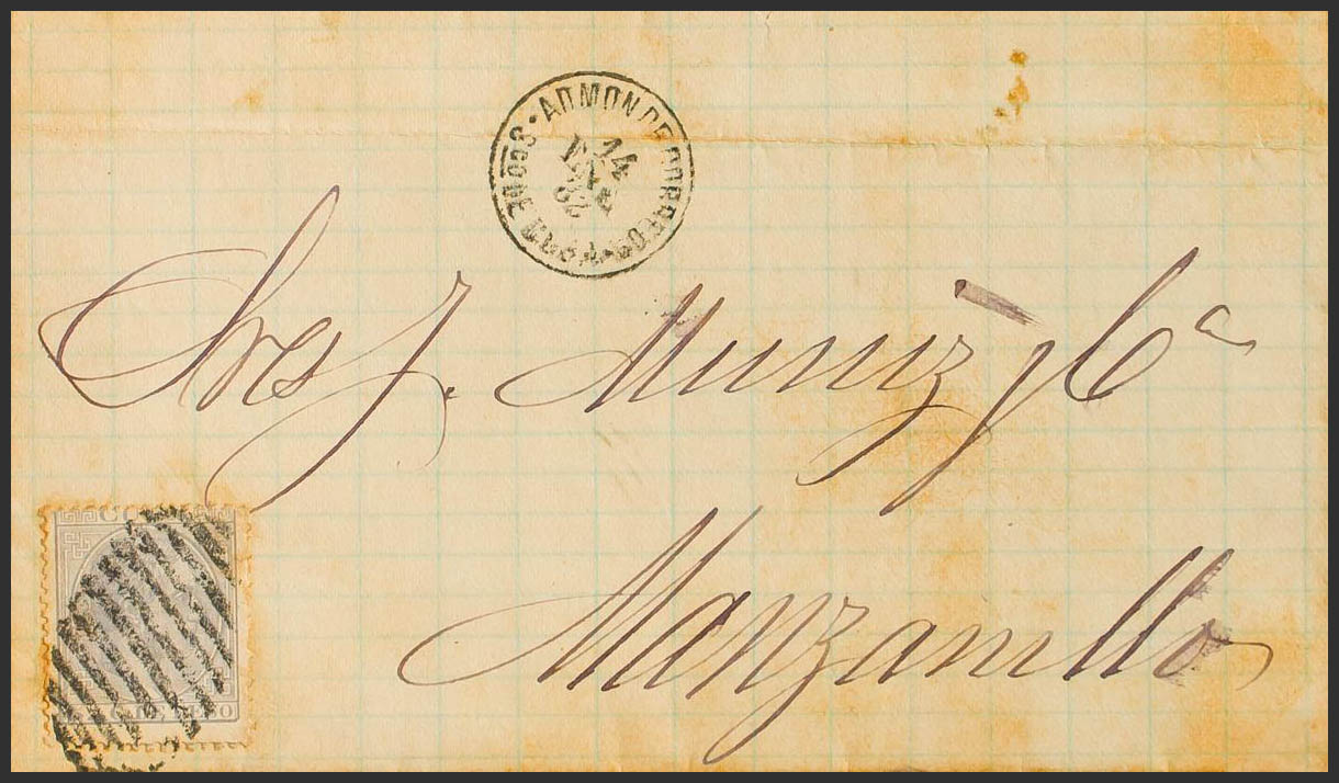 71. 1882. 5 cts gris. SANTIAGO DE CUBA a MANZANILLA. En el frente ADMON DE CORREOS / SGO DE CUBA. MAGNIFICA Y RARA.