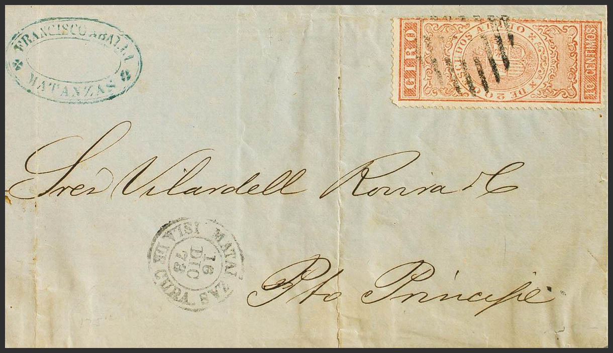 1873. 10 cts castaño FISCAL GIRO. MATANZAS (CUBA) a PUERTO-PRINCIPE. Al dorso manuscrito "Garantizado por Aurelio Ferrer", dando validez al sello fiscal en su uso como sello postal. MAGNIFICA Y RARISIMA. Cert. GRAUS.
