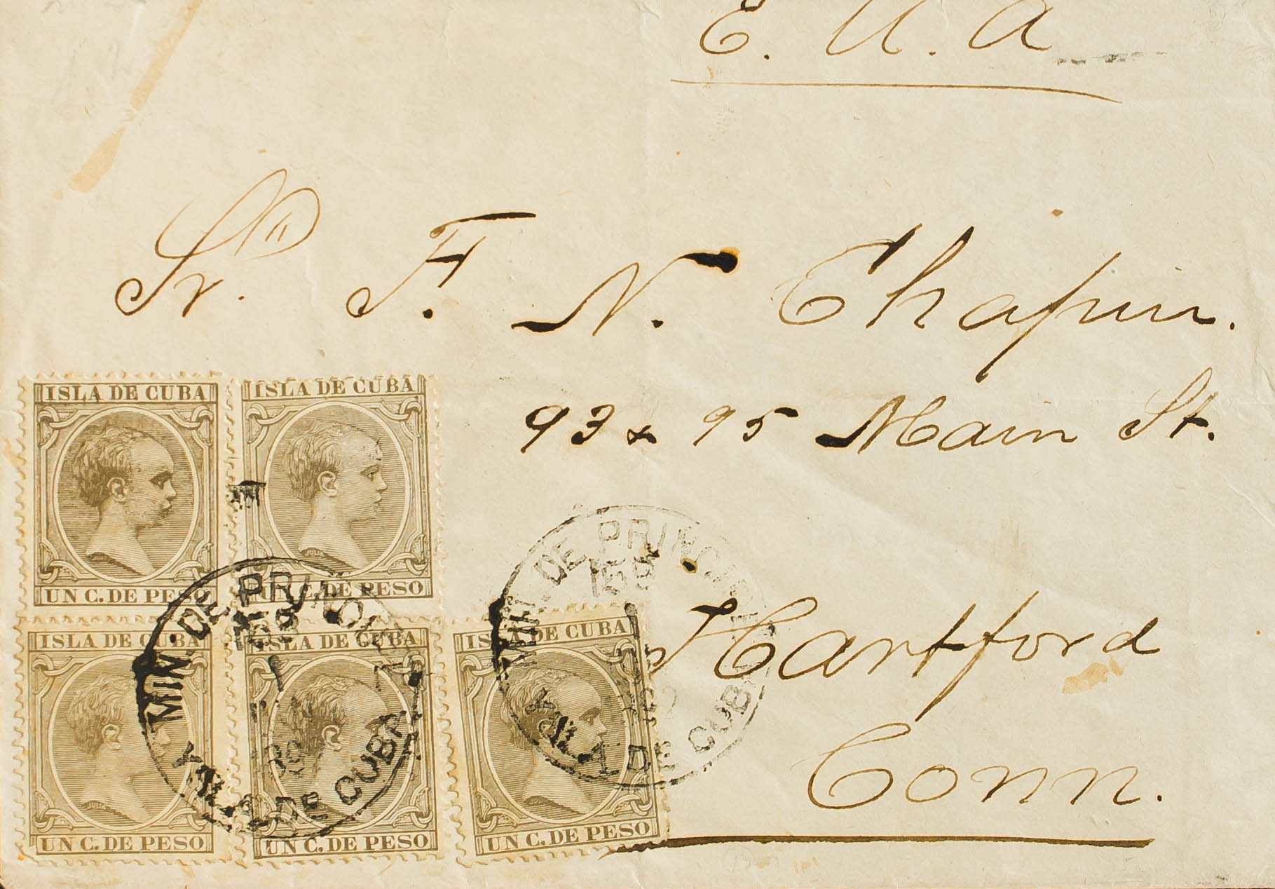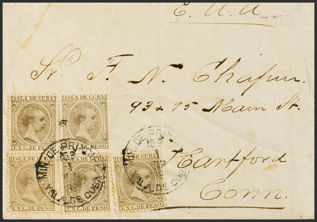 124(5). 1889. 1 cts oliva gris, cinco sellos. MIN DE PRINCIPE a HARTFORD (U.S.A.). Al dorso tránsito. MAGNIFICA Y RARISIMO FRANQUEO.