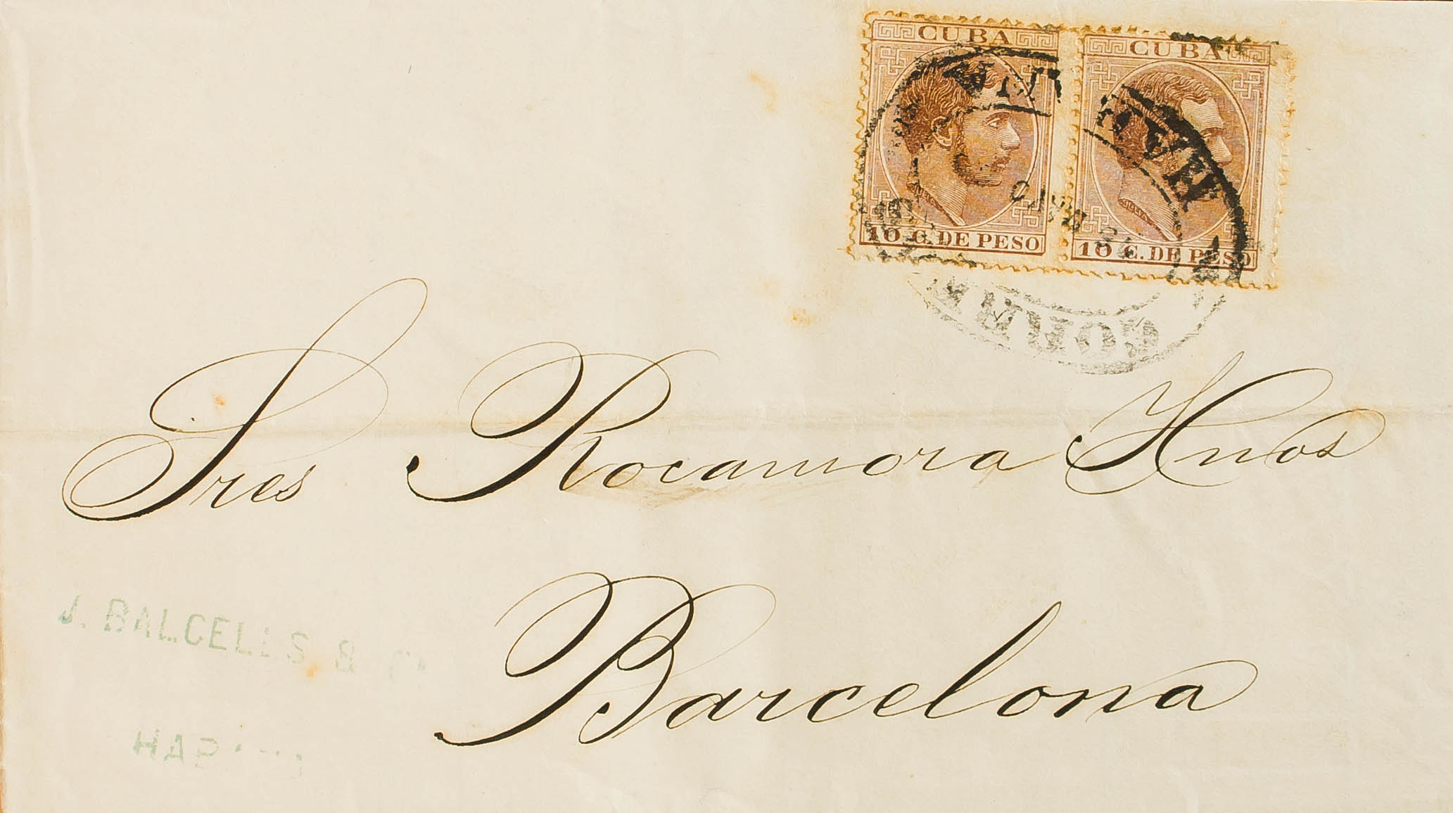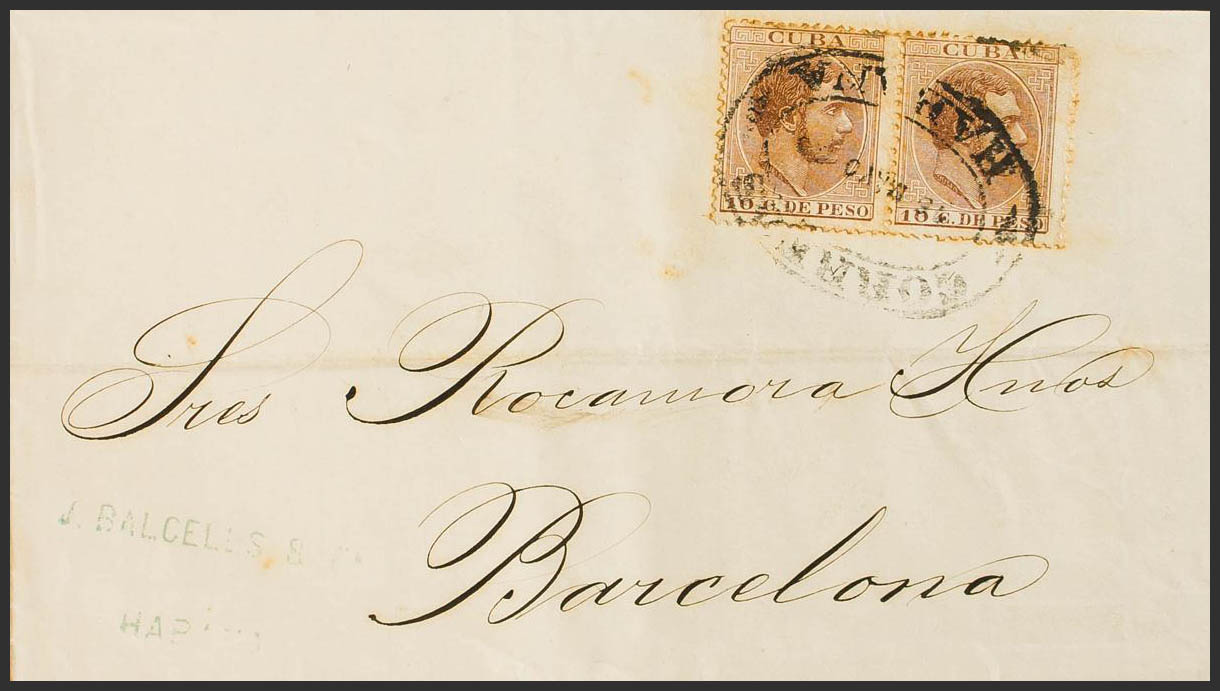 102(2). 1885. 10 cts castaño, pareja. LA HABANA a BARCELONA. Matasello CORREOS / HABANA. MAGNIFICA Y MUY RARA.
