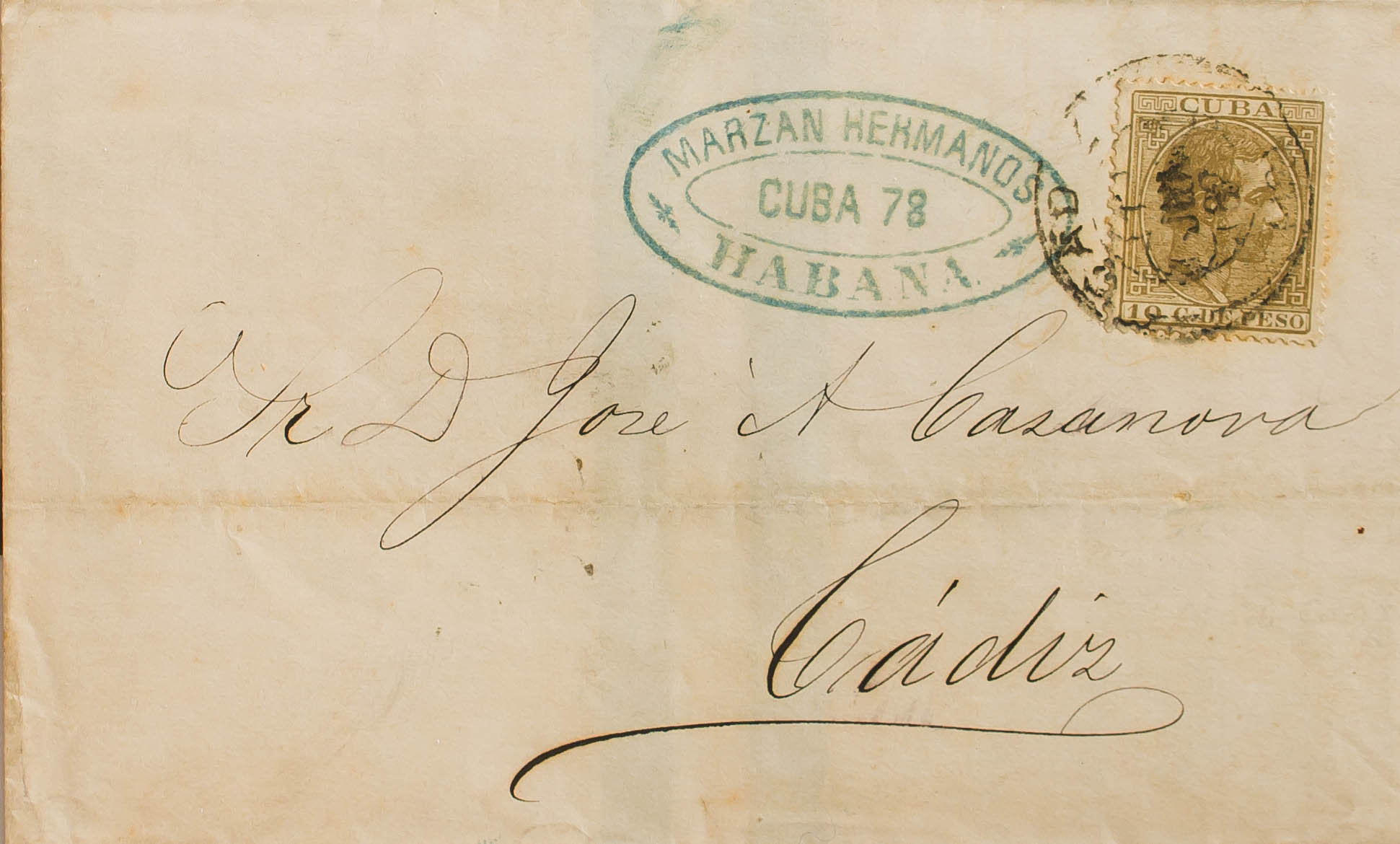 66. 1878. 10 cts castaño claro. HABANA a CADIZ. La misiva es puesta en origen en el buzón del vapor y al llegar a Cádiz se inutiliza en el puerto. MAGNIFICA Y MUY RARA.