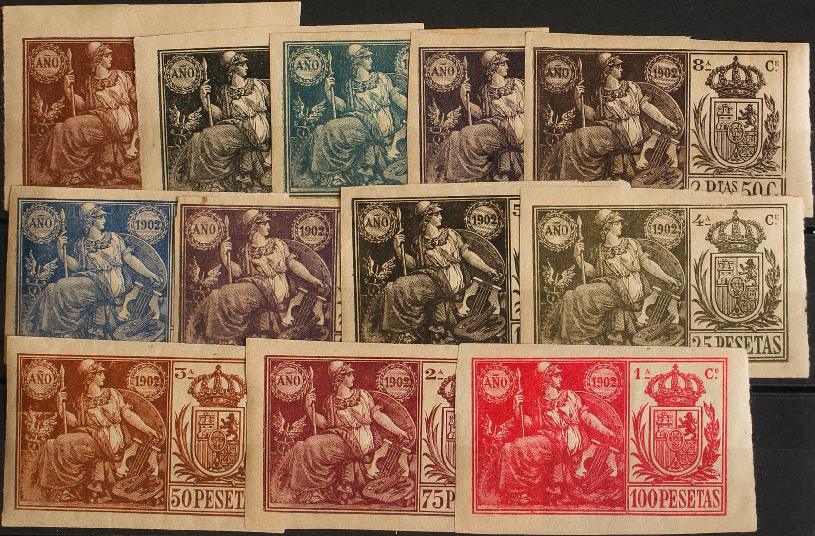 ★1902. PAPEL SELLADO de 1902. Serie completa, doce valores (idéntica a la serie emitida para la PenÃnsula en 1900, esta con indicación 1902). MAGNIFICA Y EXTRAORDINARIAMENTE RARA, ES LA PRIMERA VEZ QUE VEMOS LA SERIE COMPLETA, EN TODOS LOS CATALOGOS LA INDICAN CON EL MAXIMO GRADO DE RAREZA. (Forbin 8/19)