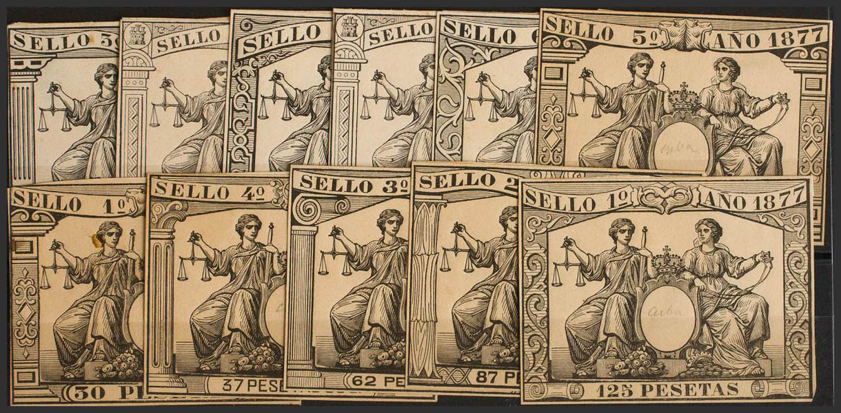 (★)1877. PAPEL SELLADO de 1877. Serie completa, once valores (impresión en negro y sobre papel cartón), diferentes valores pero mismo diseño que la serie emitida para España. MAGNIFICA Y RARISIMA.