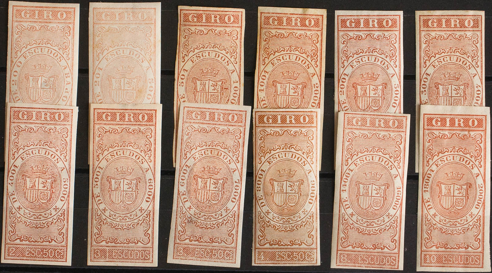★/(★)1869. SELLOS DE GIRO de 1868. Conjunto de doce ENSAYOS DE COLOR y SIN DENTAR de diferentes valores. MAGNIFICO Y RARO.