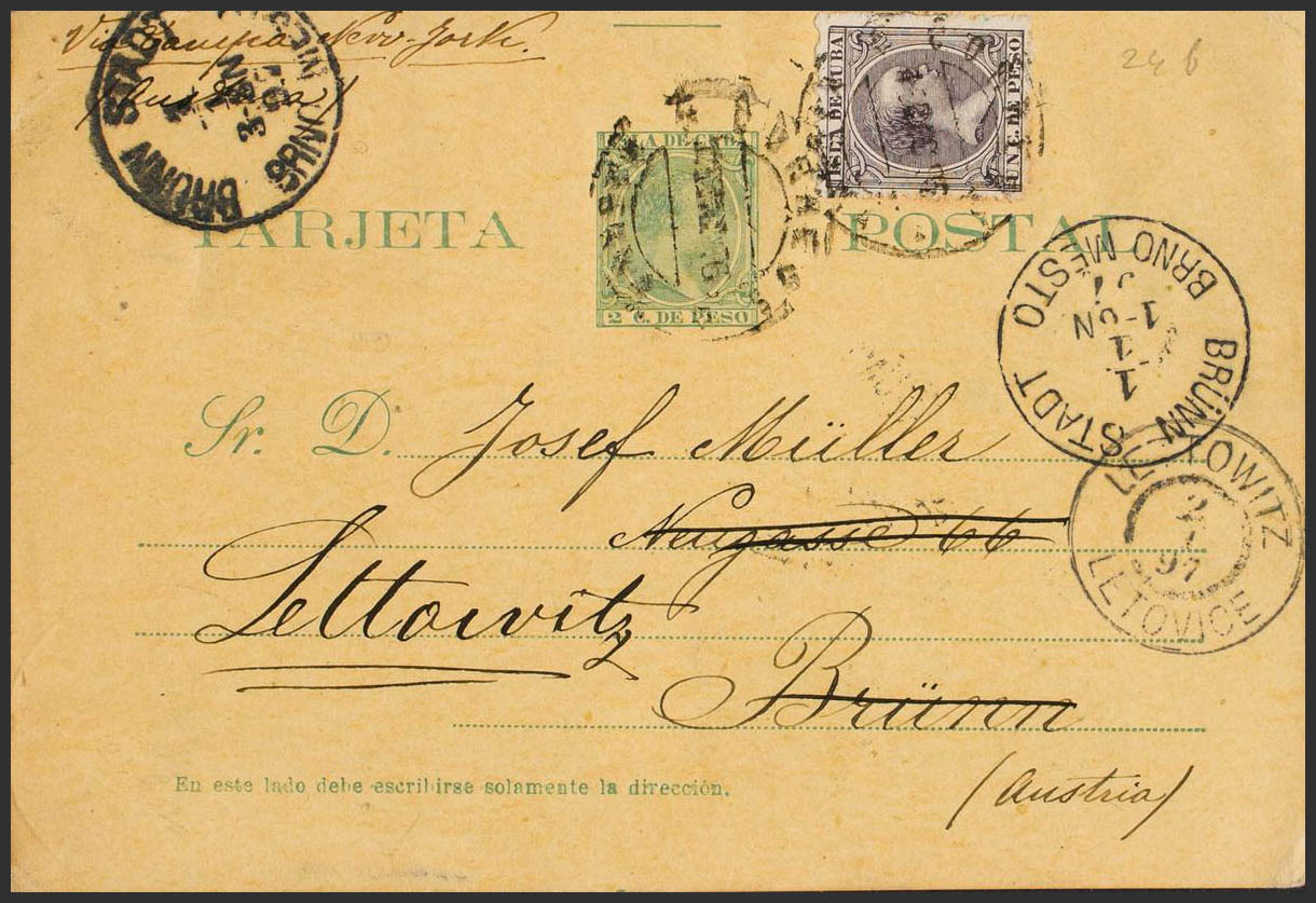 EP27, 146. 1896. 2 ctvos verde sobre Tarjeta Entero Postal de LA HABANA a BRNO (actual República Checa), con franqueo complementario de 1 ctvo violeta, y reexpedida a LETOVICE. En el frente manuscrito "VÃa Tampa y New York" y llegadas. MAGNIFICA Y MUY RARO DESTINO CON ORIGEN EN CUBA.