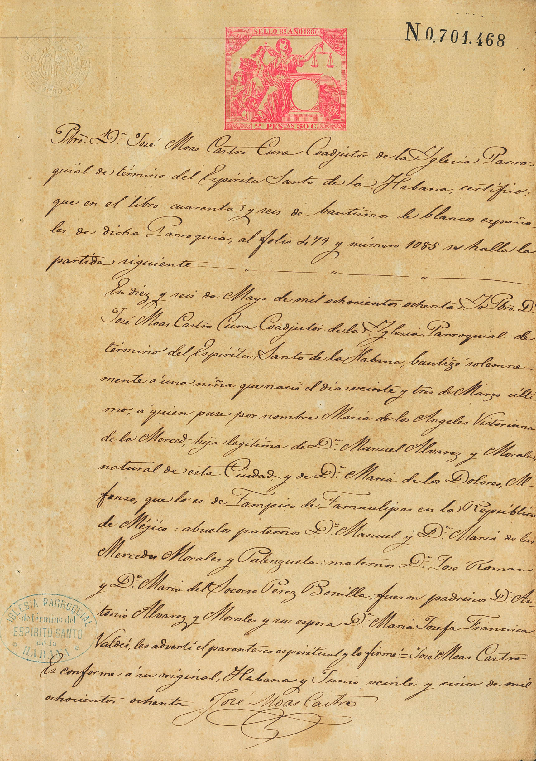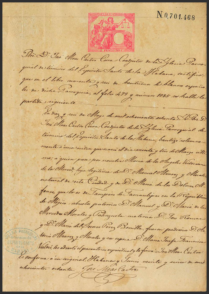 1880. 2´50 pts rosa sobre PAPEL SELLADO (fiscal) sobre partida de bautismo de LA HABANA. MAGNIFICA.