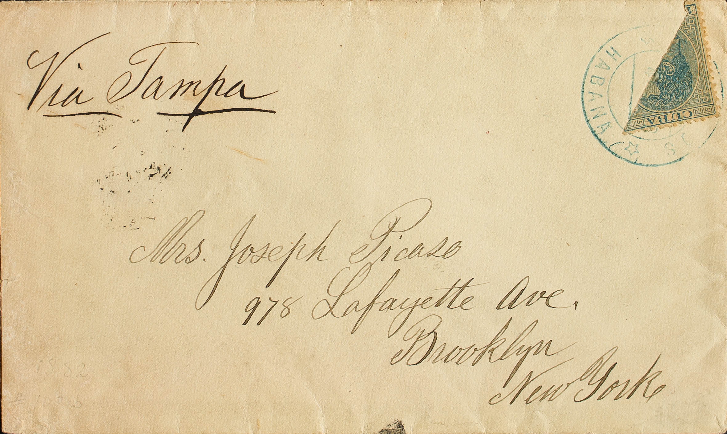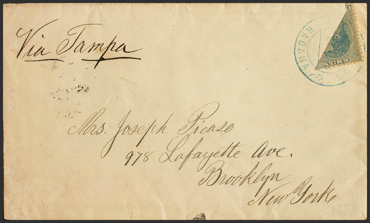 103f. 1888. 10 ctvos azul BISECTADO. LA HABANA a NUEVA YORK (U.S.A.). Matasello CORREOS / HABANA, en azul. MAGNIFICA Y RARA. Edifil 2013: 250 Euros