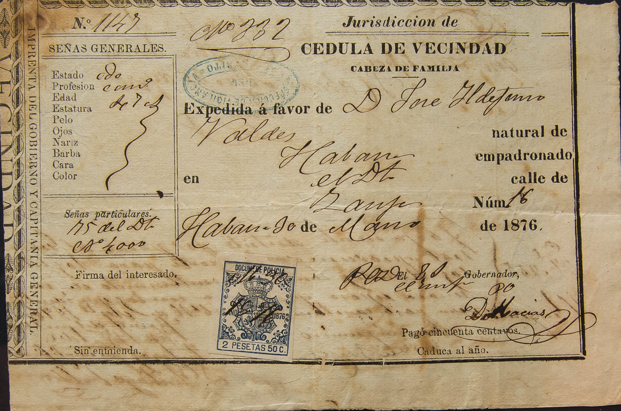 △1876. 2´50 pts azul FISCAL de POLICIA. Cédula de Vecindad de LA HABANA (CUBA). MAGNIFICA Y RARA.