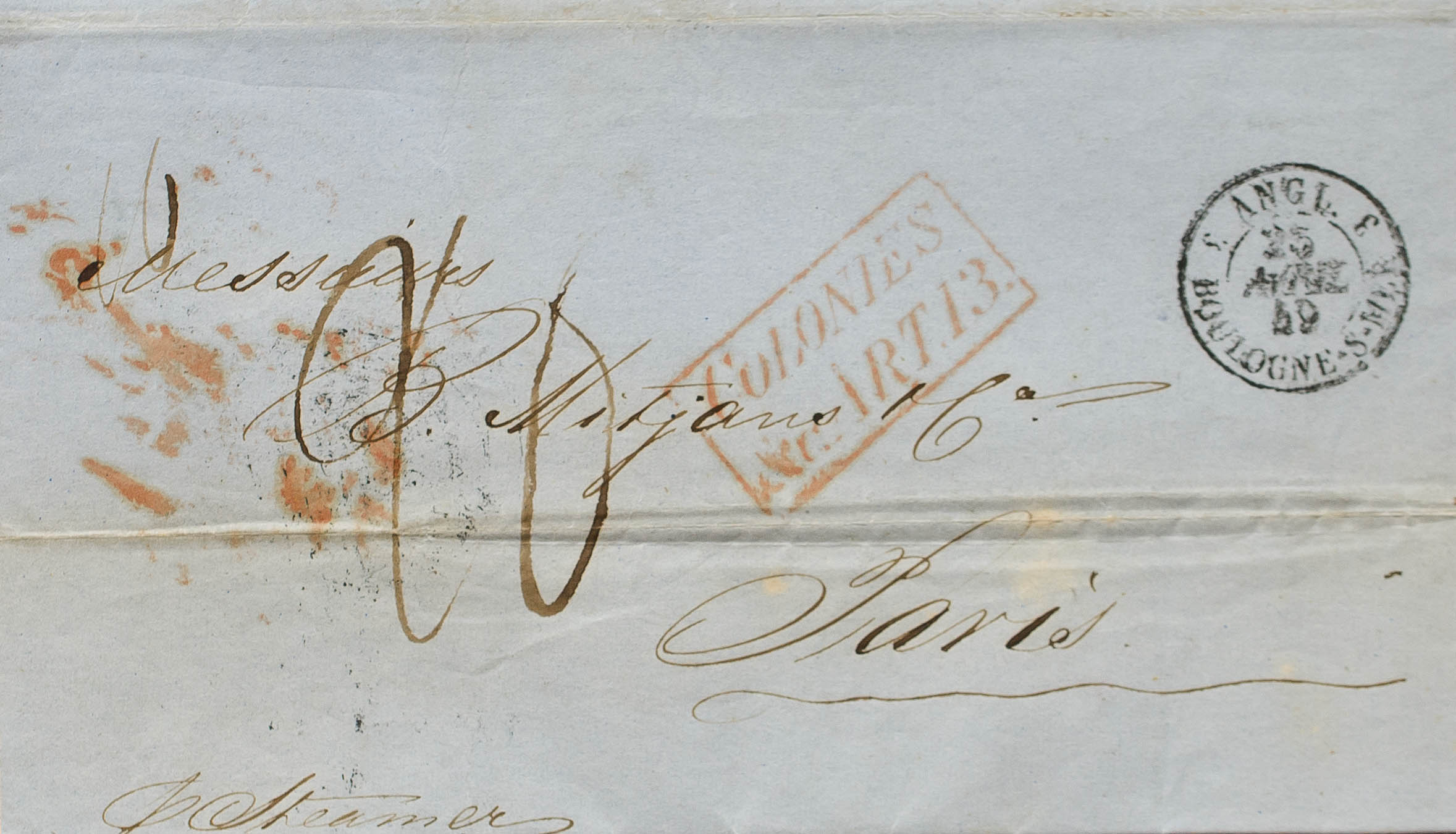 1849. LA HABANA a PARIS (FRANCIA). Marca COLONIES / AND C.ART.13 y porte manuscrito "20", al dorso fechador HAVANA, de la Agencia Postal Británica (P.E.75) edición 2004. MAGNIFICA.